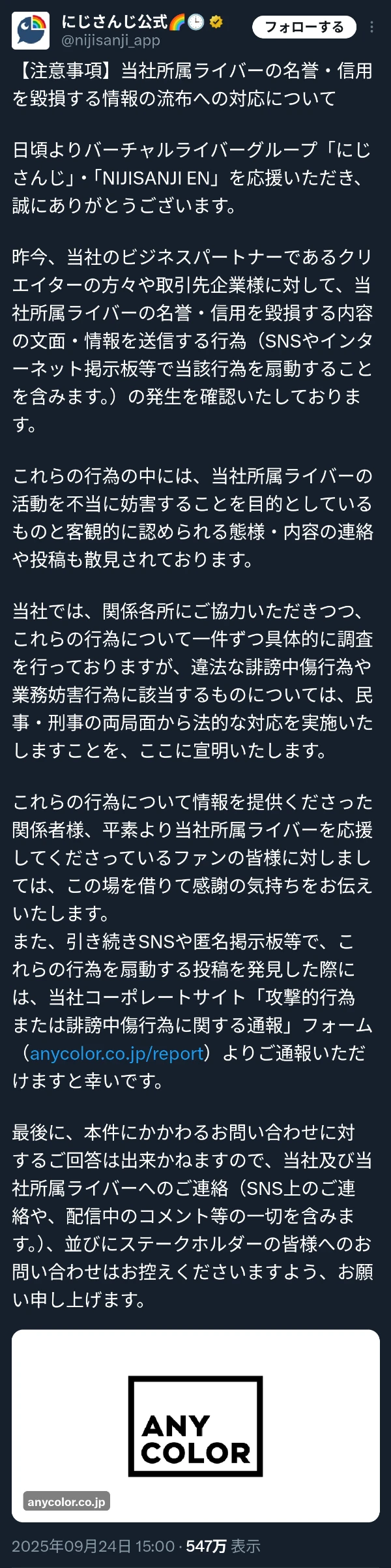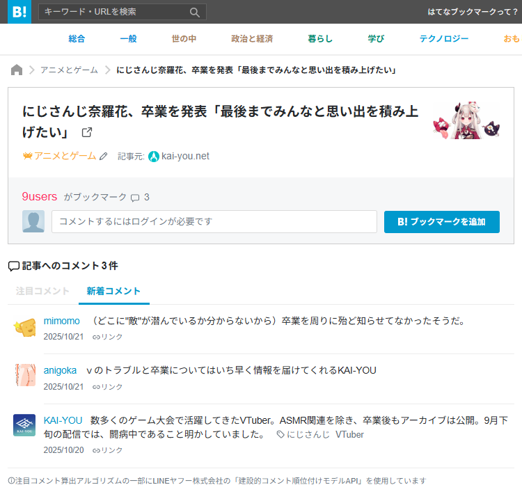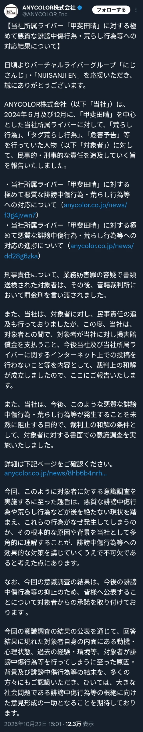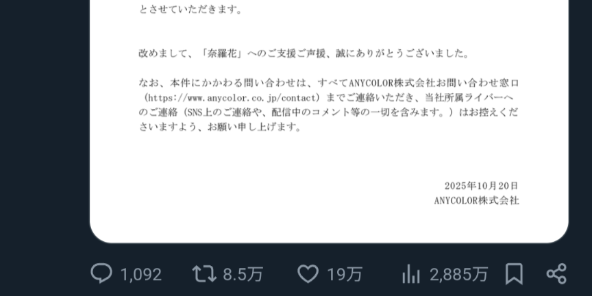 | … | 3無題Name名無し 25/10/20(月)19:24:33No.1902645そうだねx4にじさんじ運営会社ANYCOLORによる違法疑いの行為等が確認された場合は上記通報先に加えて以下にも通報を |