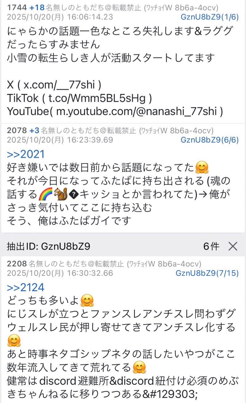 | … | 13無題Name名無し 25/10/20(月)19:33:37No.1902659+Xで他箱中傷をしているアカウントがにじリスかを確認するためのスクリーニングワードファイル |