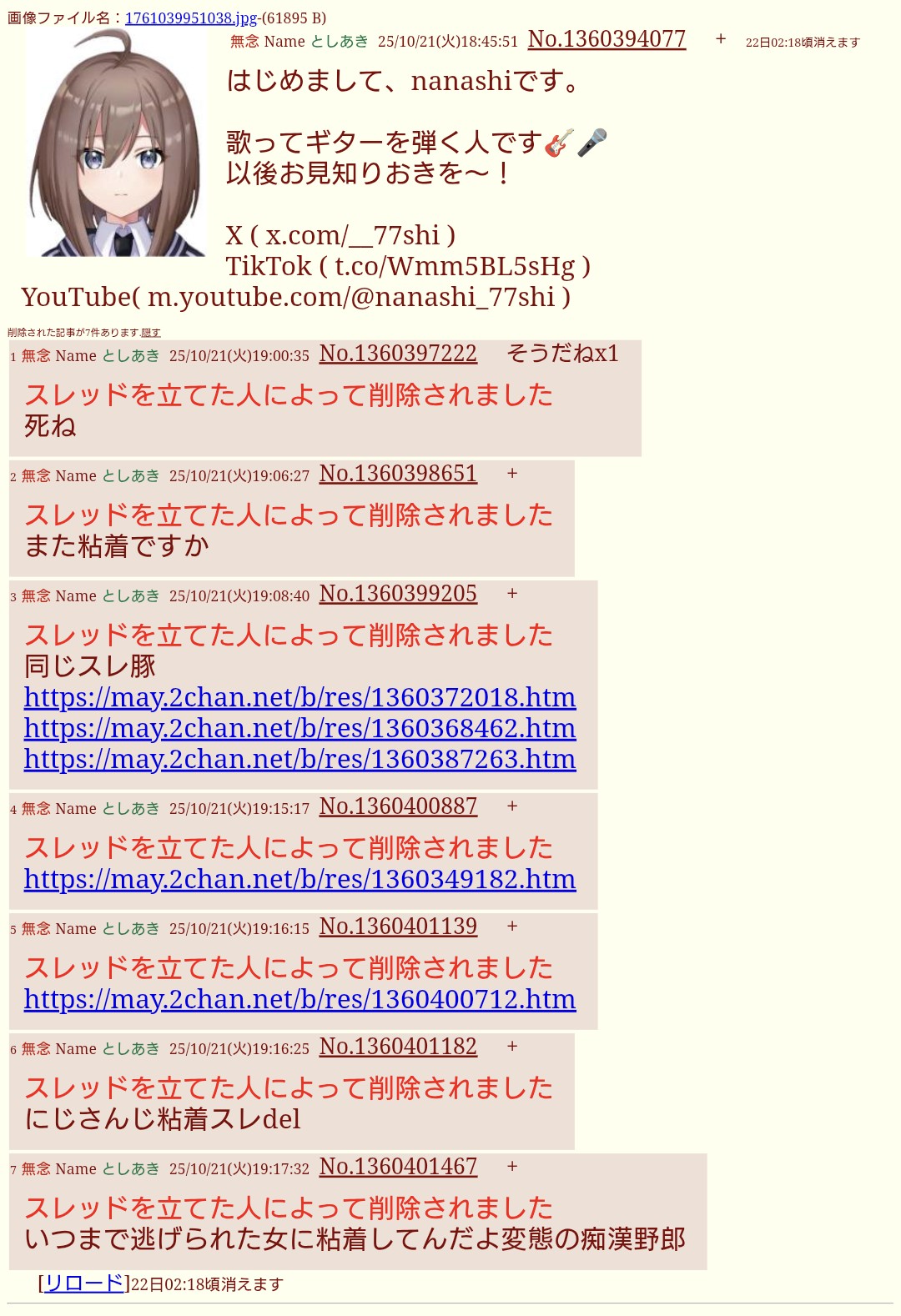 | … | 78無題Name名無し 25/10/20(月)20:17:40No.1902728+本人の言い方だとストーカー仕事関係者っぽいんだよな |