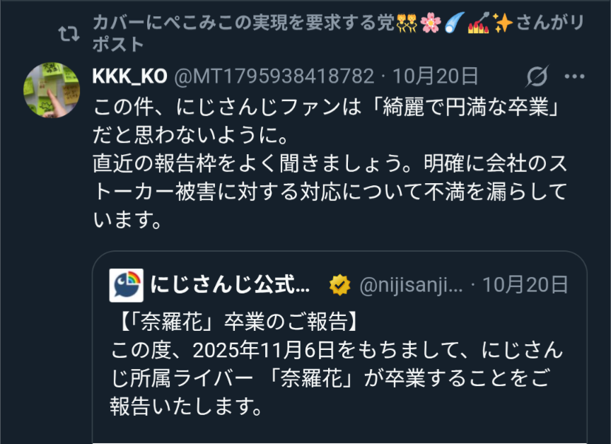 | … | 1594無題Name名無し 25/10/25(土)00:05:48No.1904456+ストーカーの件は解決してて卒業とは関係ないってにじリスが言ってたのに… |