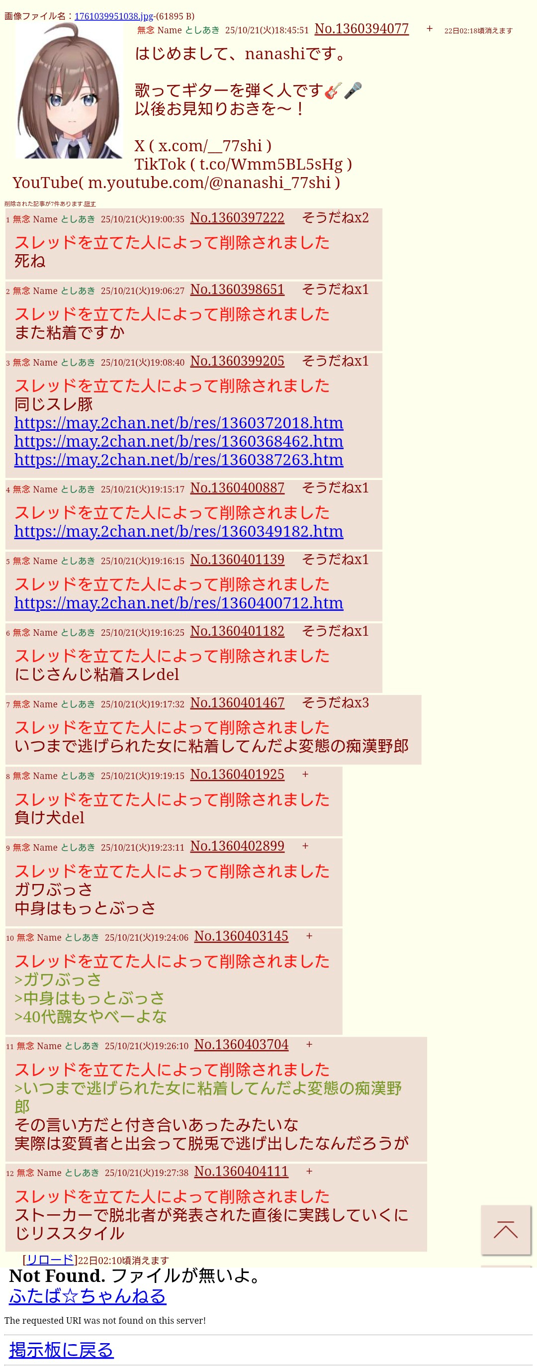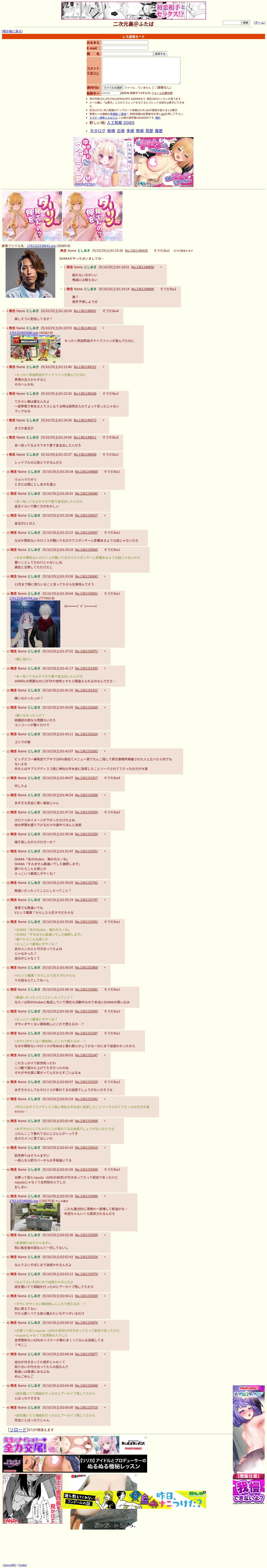 | … | 54無題Name名無し 25/10/20(月)20:05:53No.1902702そうだねx2>>仕事に関わってる奴がストーカーしてるなら他のライバーも危ないだろ… |