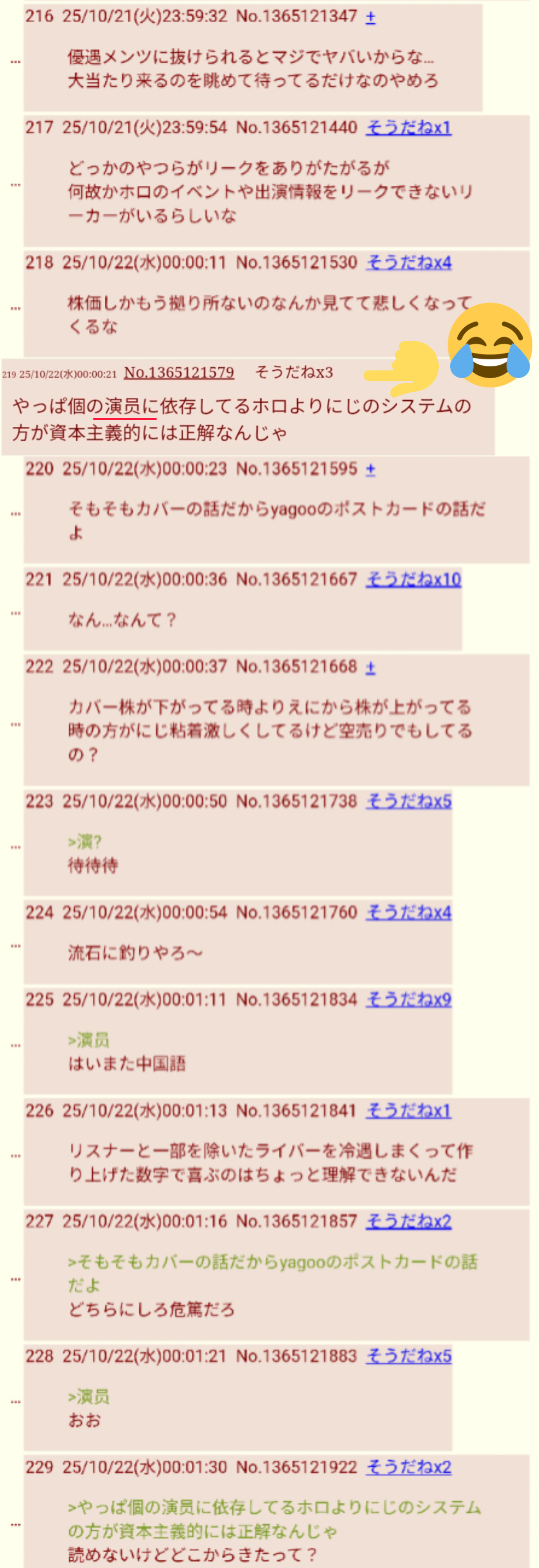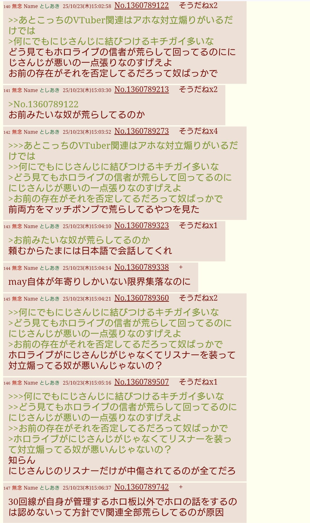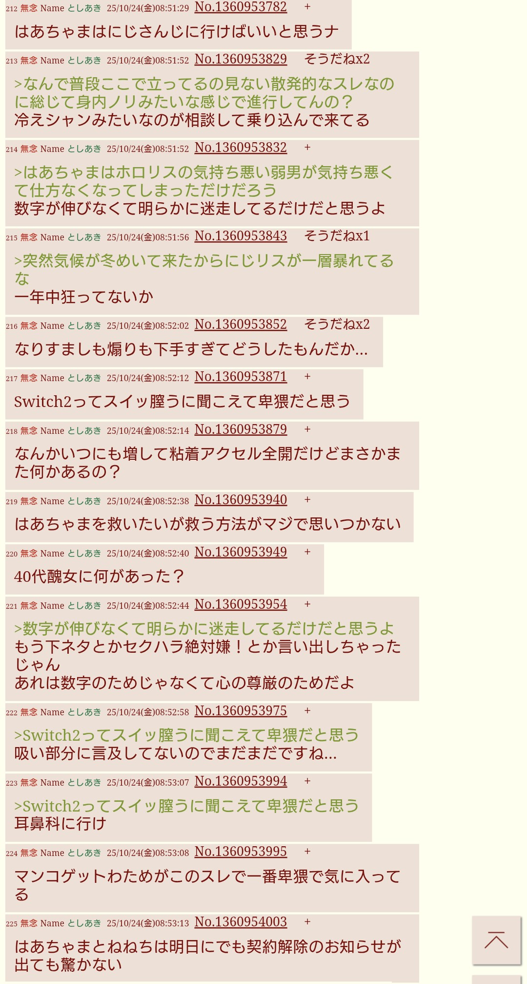 | … | 1570無題Name名無し 25/10/24(金)22:10:11No.1904428+>皮肉っぽい書き方でまるで当事者みたいににじ側の手の内を明かす奴よく湧くよね |