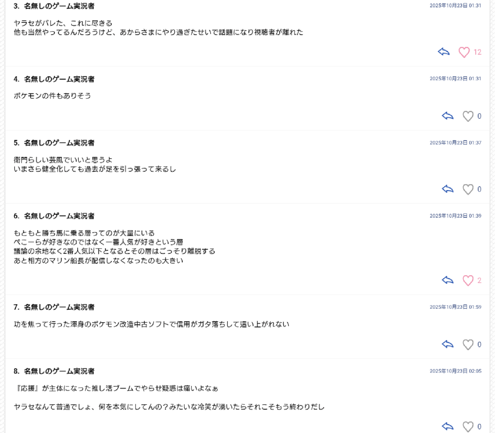 | … | 32無題Name名無し 25/10/20(月)19:54:04No.1902680そうだねx1どう解決したのか知らないけど他のライバーは安全と言い切れるのか? |
