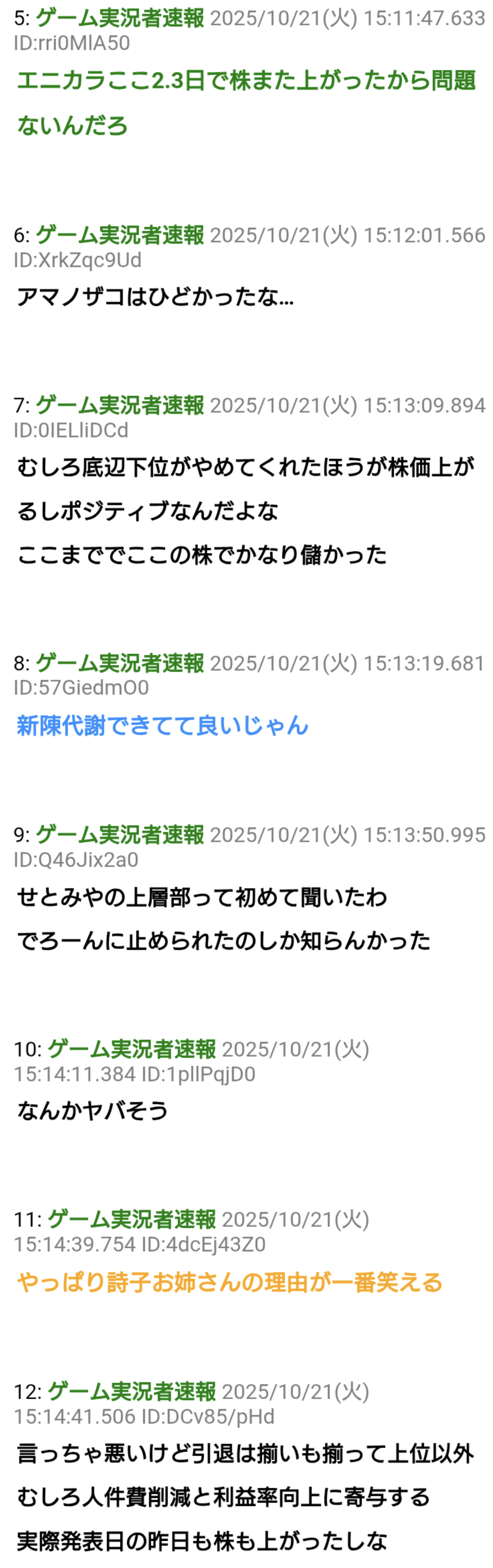 | … | 12無題Name名無し 25/10/20(月)19:32:58No.1902656+>他社は卒業発表で一割株が下がったけどエニカラは一割上がるんだな |