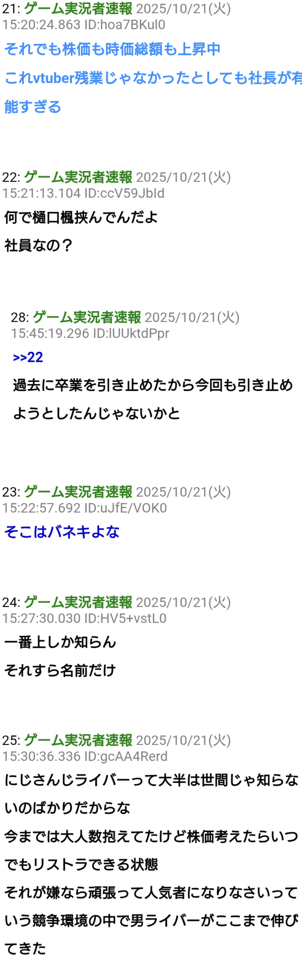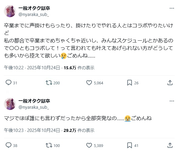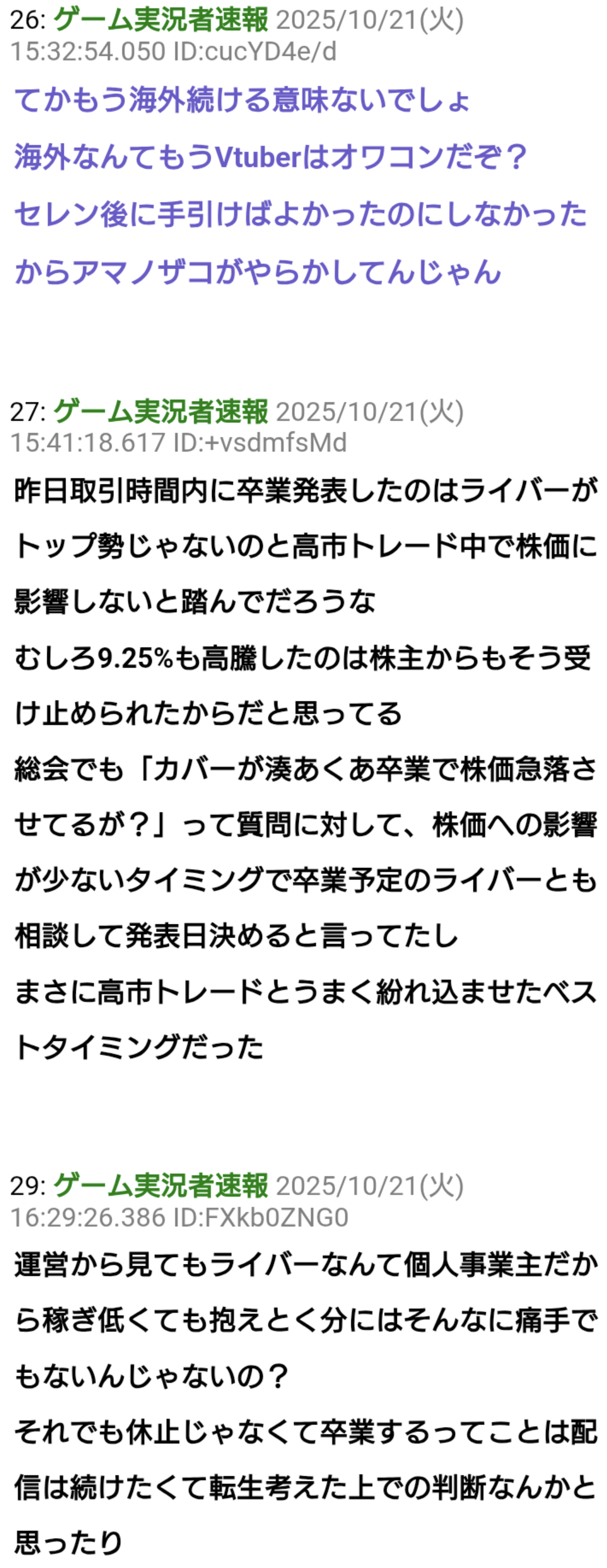 | … | 63無題Name名無し 25/10/20(月)20:10:38No.1902712そうだねx5>ライバーにもほとんど卒業することを言えてなくて(3〜4人くらい) |