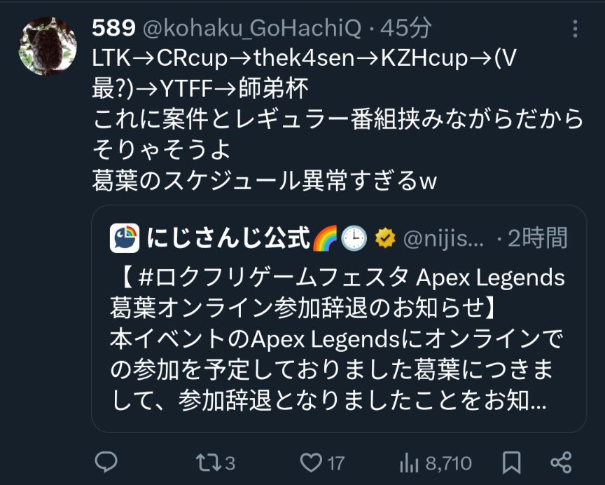| … | 1515無題Name名無し 25/10/24(金)19:13:18No.1904367+>一日たっても葛葉辞退の代打の公式情報出てこないし発表時の配信担当者への連絡ミス程度ってレベルじゃない感じなのかこれ |