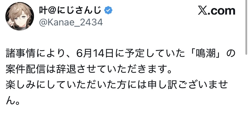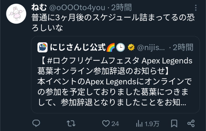 | … | 1517無題Name名無し 25/10/24(金)19:14:32No.1904369+>一日たっても葛葉辞退の代打の公式情報出てこないし発表時の配信担当者への連絡ミス程度ってレベルじゃない感じなのかこれ |