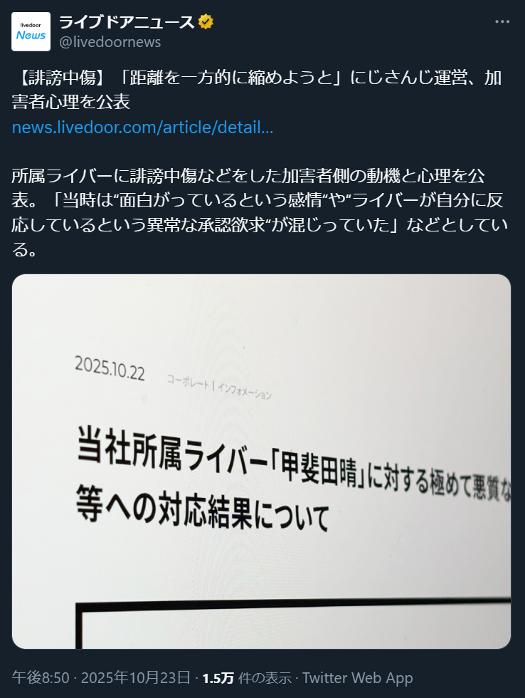 | … | 14無題Name名無し 25/10/20(月)19:34:35No.1902660そうだねx21 1760956475182.jpg-(398758 B) ストーカー被害について本人が語っていたので乗せておく |