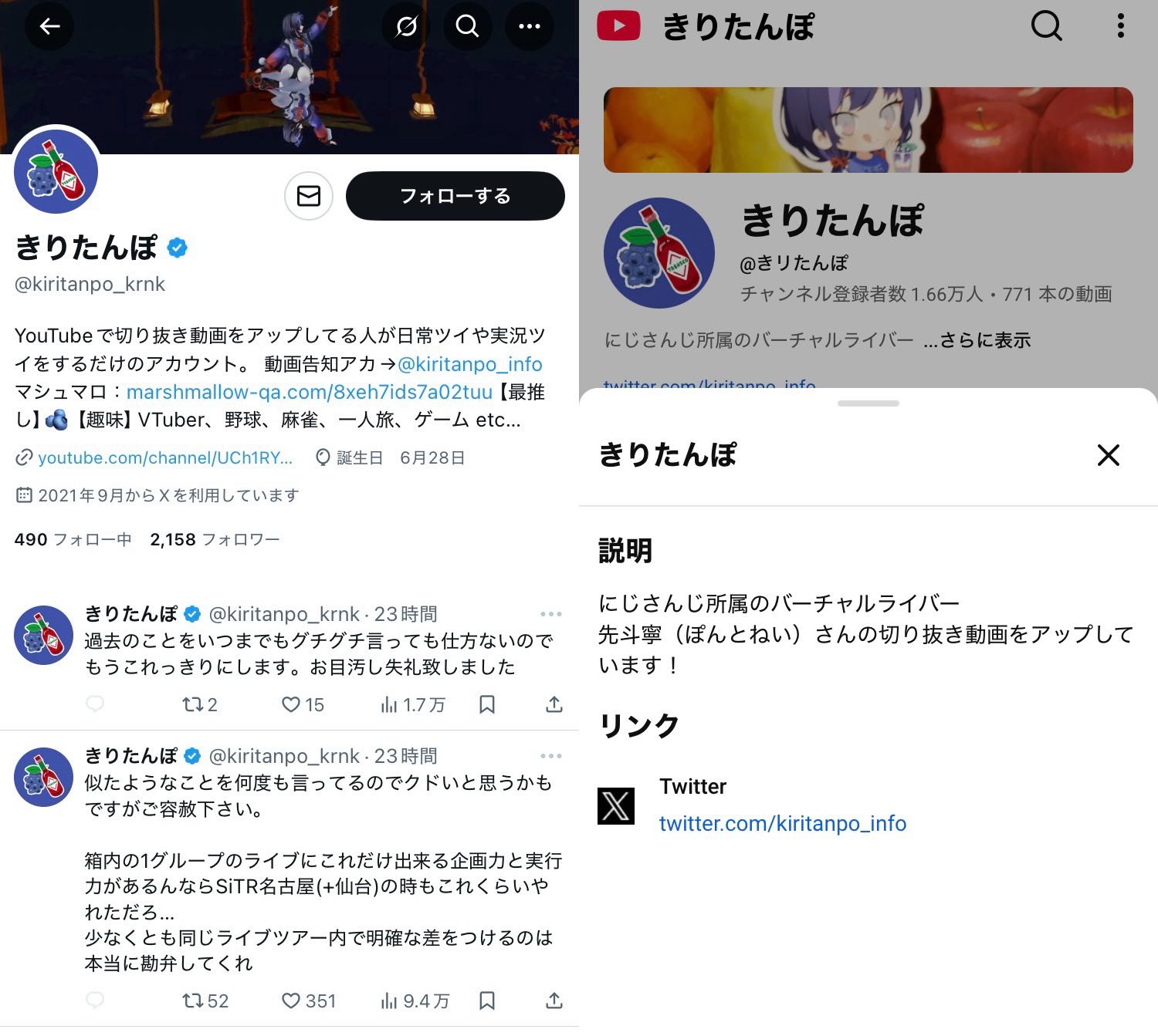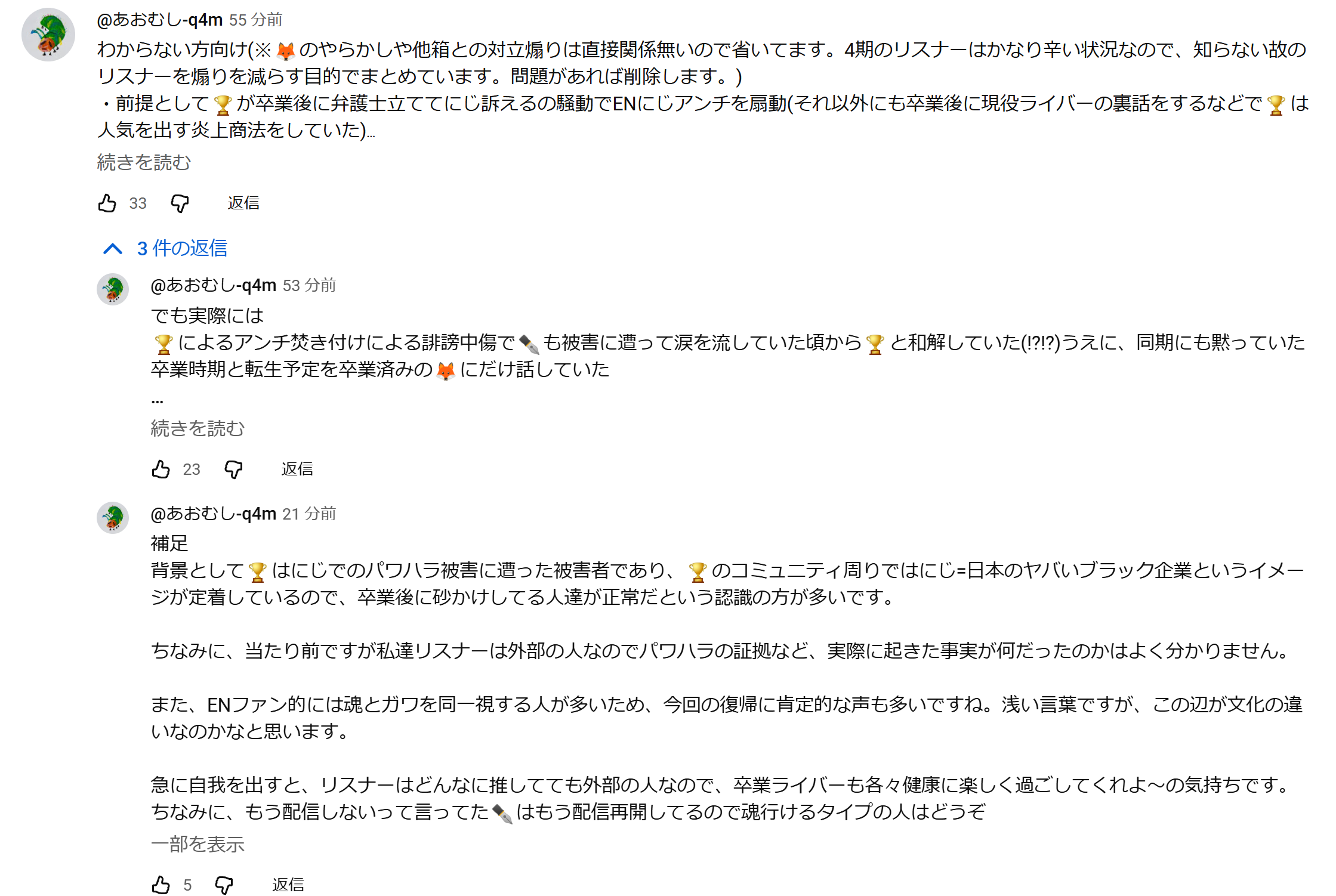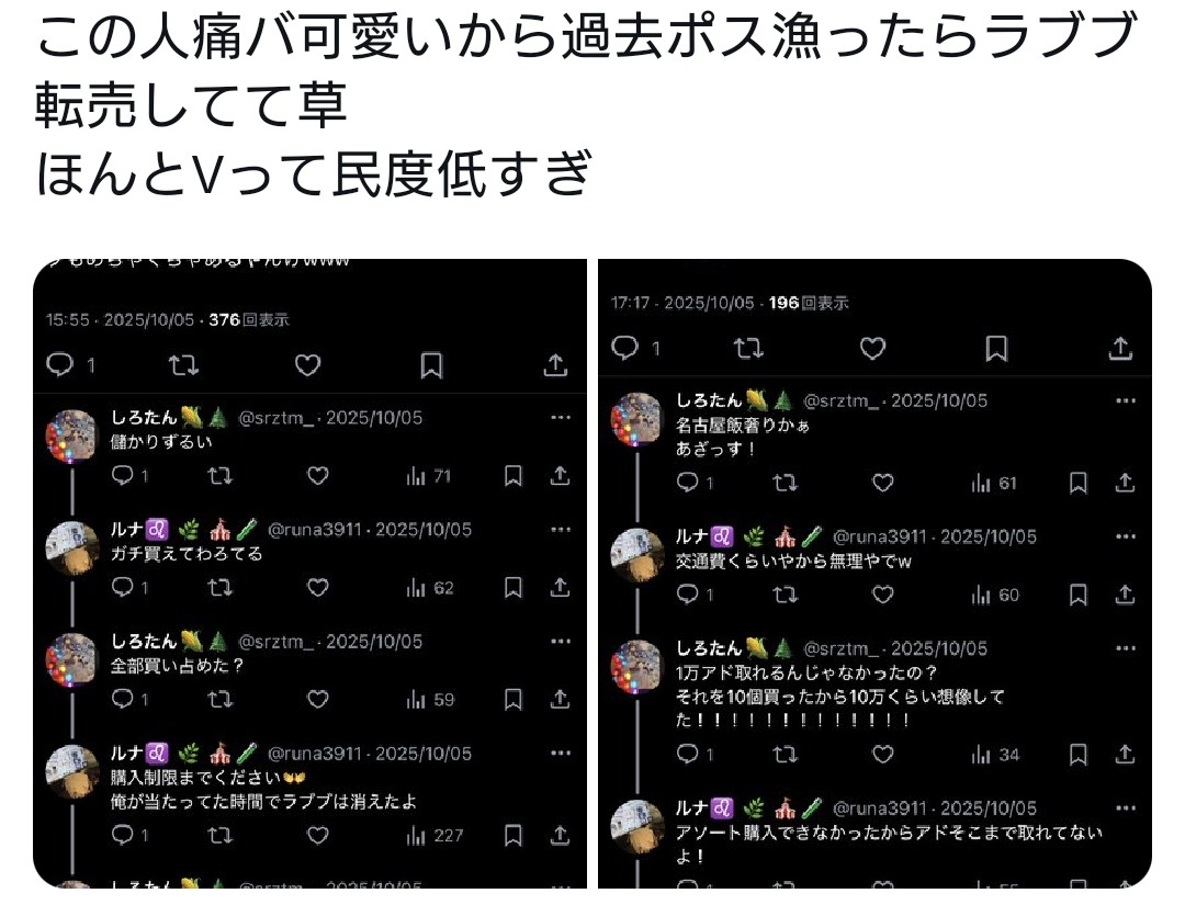 | … | 68無題Name名無し 25/11/01(土)07:47:13No.1907382そうだねx17※このスレはにじさんじの運営、ライバー、リスナーの迷惑行為や道徳に反する行動を収集するスレです |