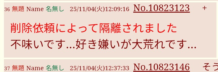 | … | 26無題Name名無し 25/11/01(土)03:01:22No.1907334+書き込みをした人によって削除されました |