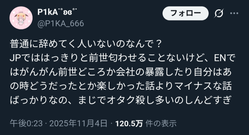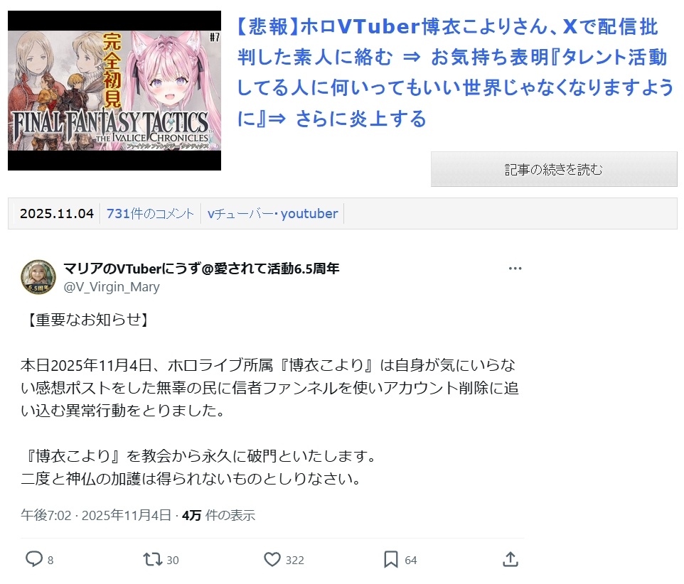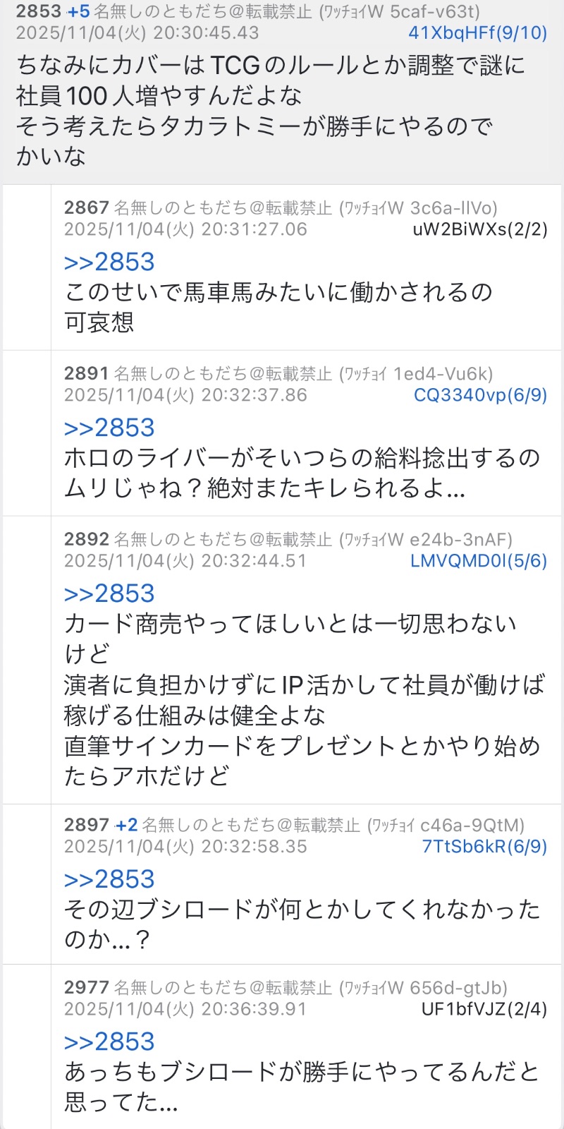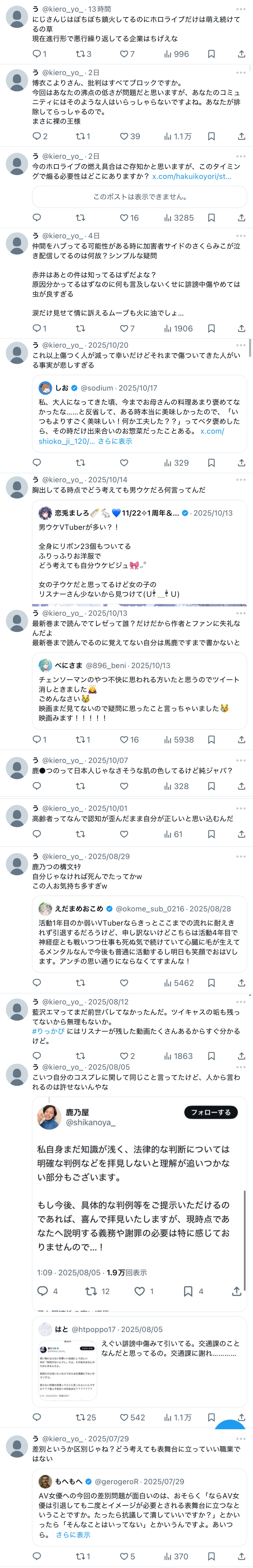 | … | 84無題Name名無し 25/11/01(土)08:35:47No.1907398そうだねx7>いろんなホロメンが定期的に会社の許可を得て釘をぶっ刺す発言をしてきてのこれだもんな |