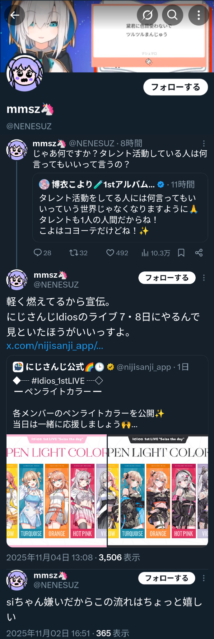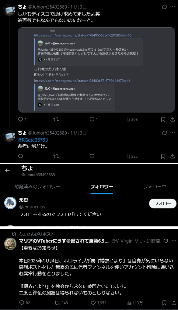 | … | 2無題Name名無し 25/11/01(土)01:49:01No.1907308そうだねx8にじさんじ支持者やエニカラ社員の疑いがある人物による他社への中傷を見かけたときの各社通報先 |