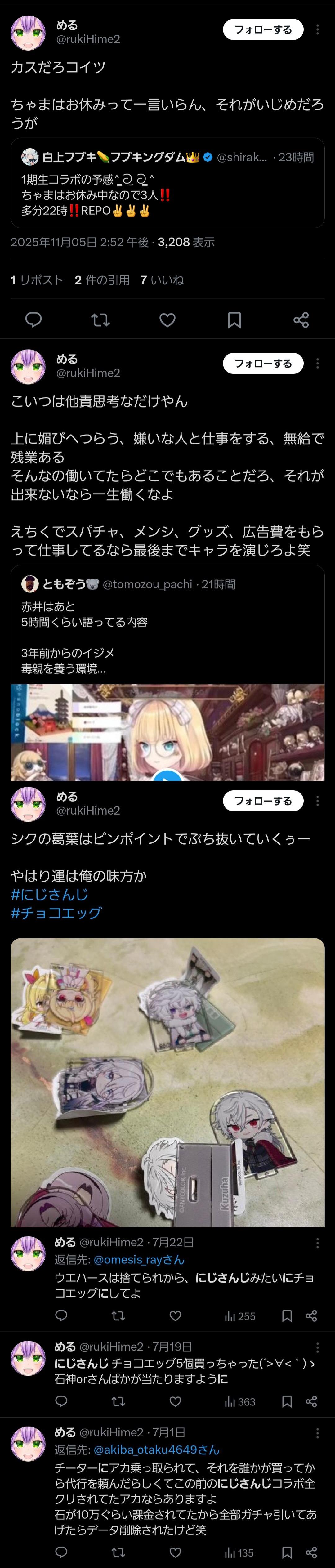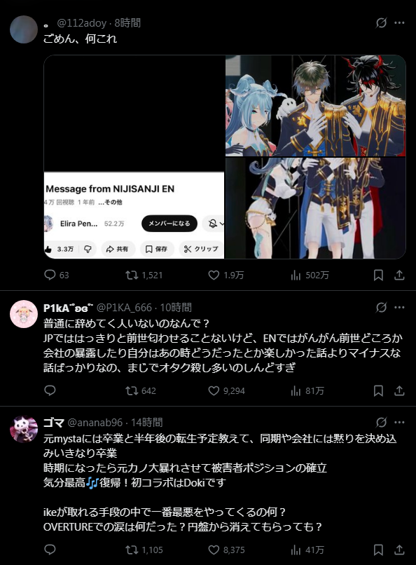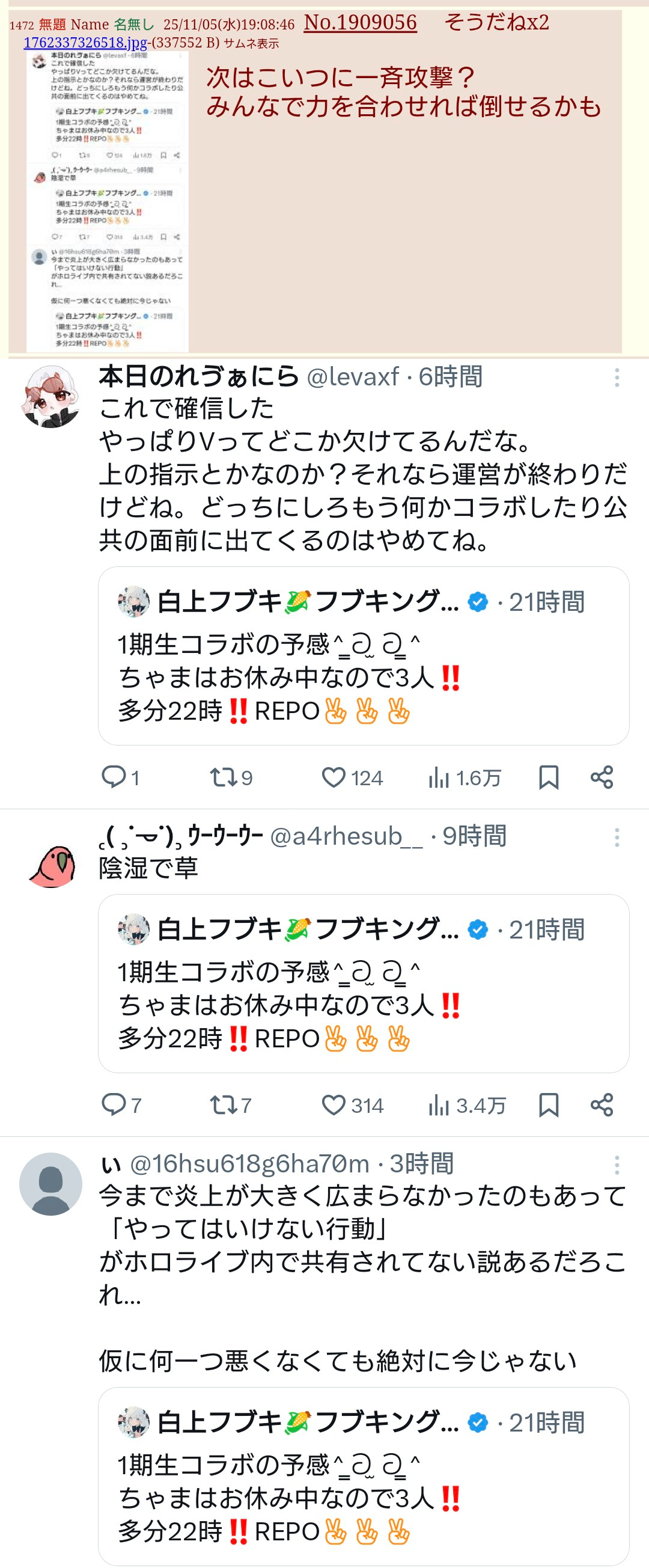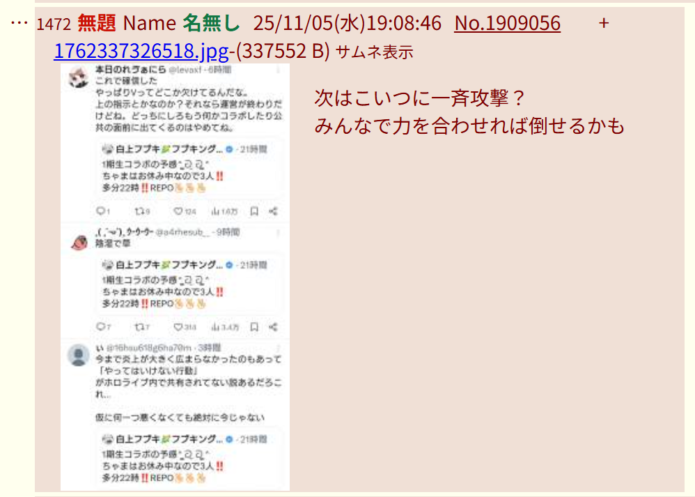 | … | 51無題Name名無し 25/11/01(土)05:30:05No.1907363そうだねx23 1761942605392.jpg-(408691 B) 勝手に燃えてるのをホロライブのせいにするにじリス |