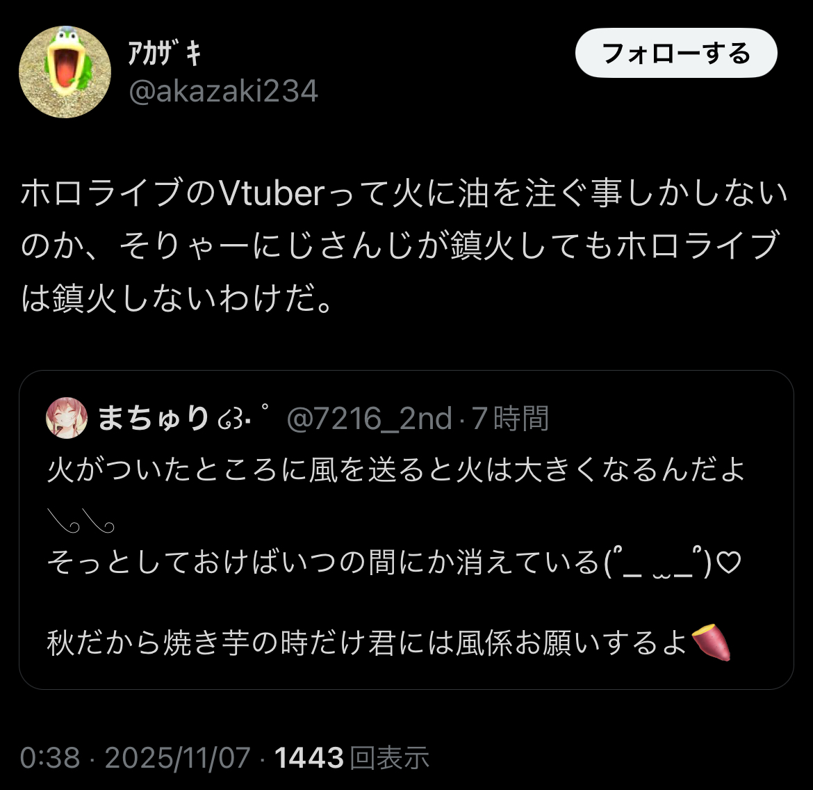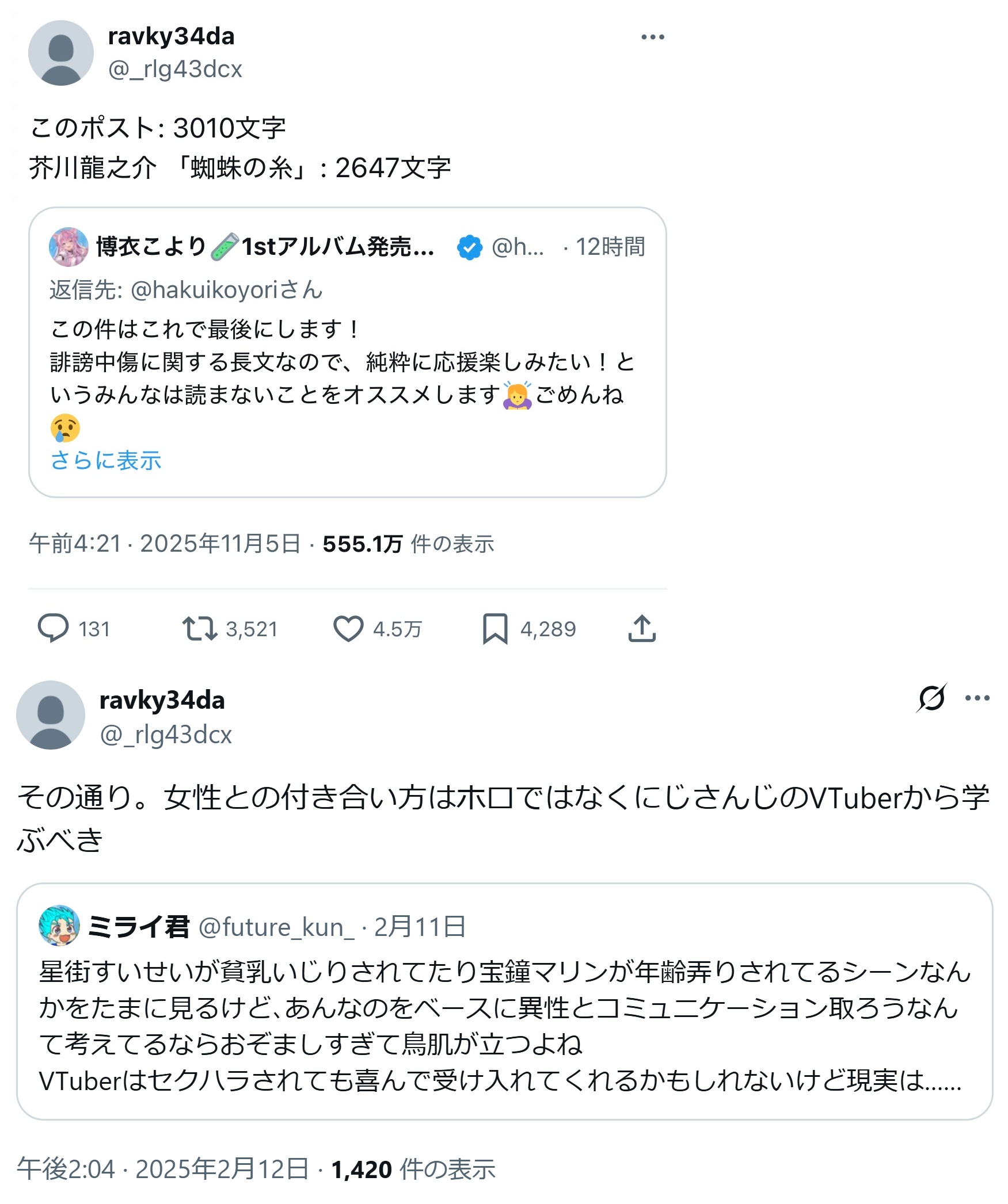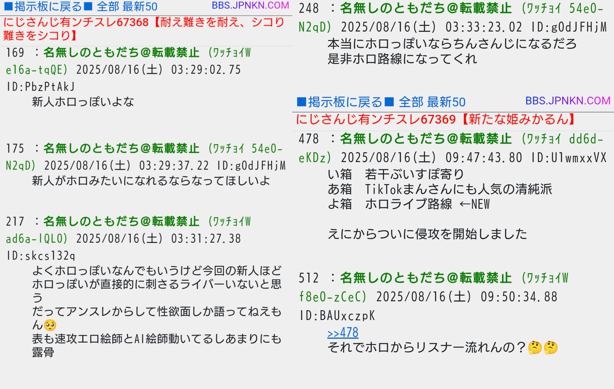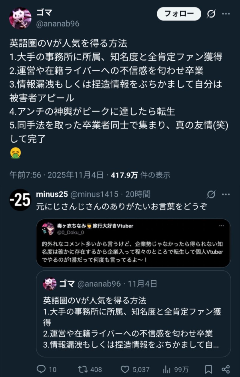 | … | 51無題Name名無し 25/11/01(土)05:30:05No.1907363そうだねx23 1761942605392.jpg-(408691 B) 勝手に燃えてるのをホロライブのせいにするにじリス |