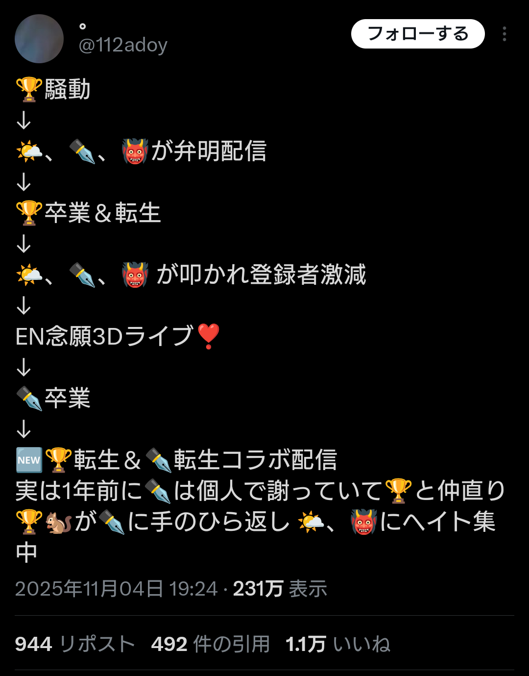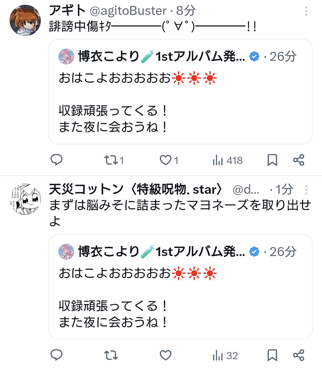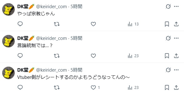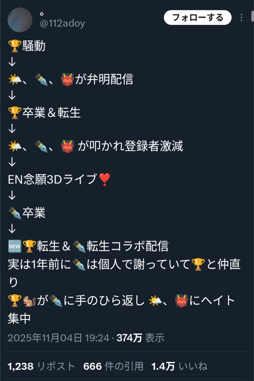 | … | 96無題Name名無し 25/11/01(土)08:52:24No.1907410そうだねx30>これまでは単なるアンチなら放置や我慢して自分達の活動に集中した方がクオリティも上がるし時間に無駄が少ないって判断だったんだろう |