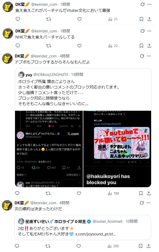 | … | 78無題Name名無し 25/11/01(土)08:24:06No.1907392そうだねx32いろんなホロメンが定期的に会社の許可を得て釘をぶっ刺す発言をしてきてのこれだもんな |
