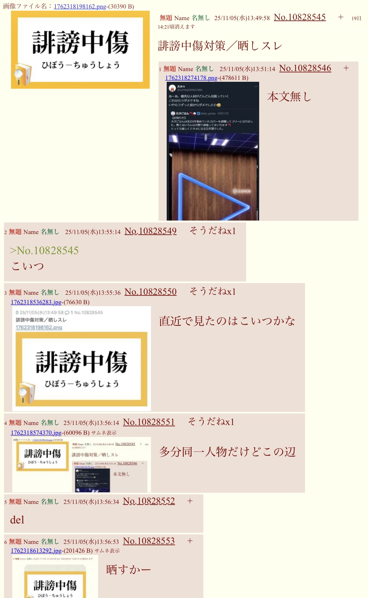| … | 69無題Name名無し 25/11/01(土)07:48:09No.1907383そうだねx13【頭のおかしい一部勢力が監視してるので見つけ次第delをお願いします】 |
