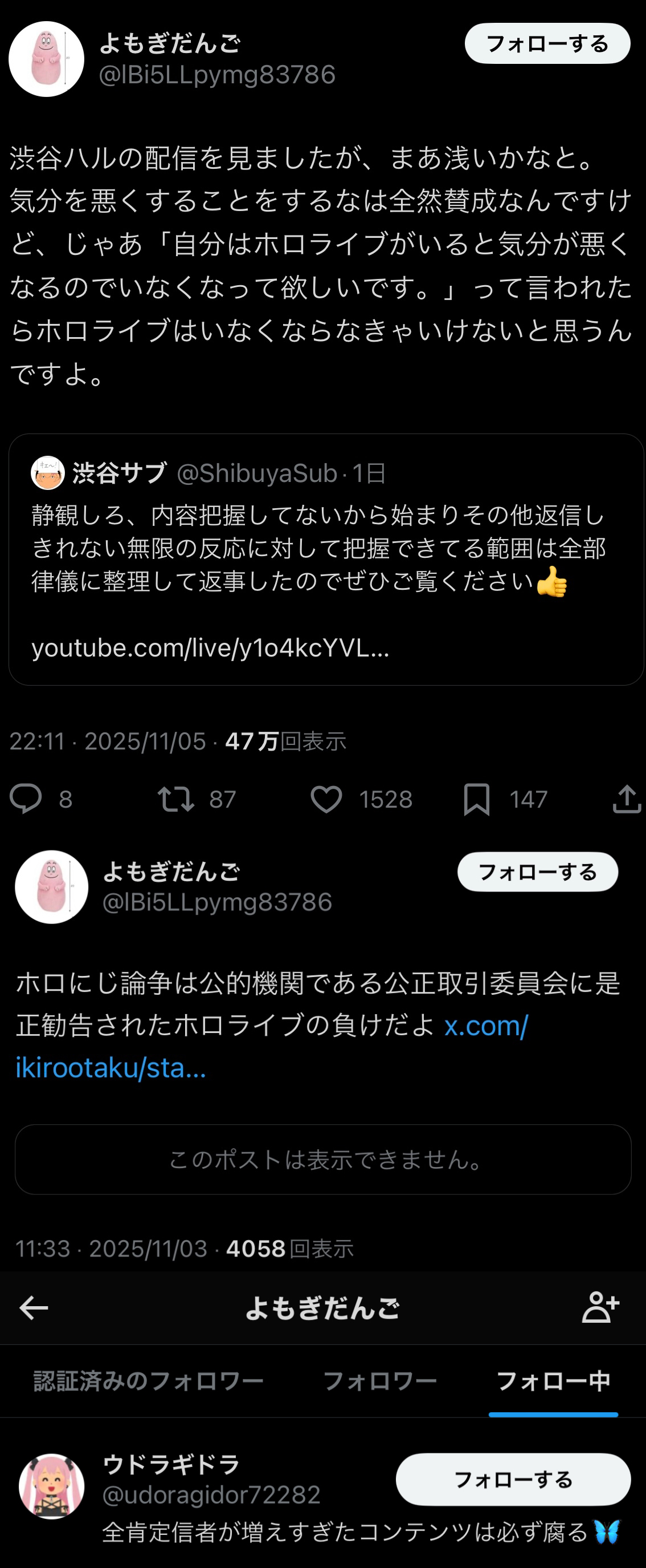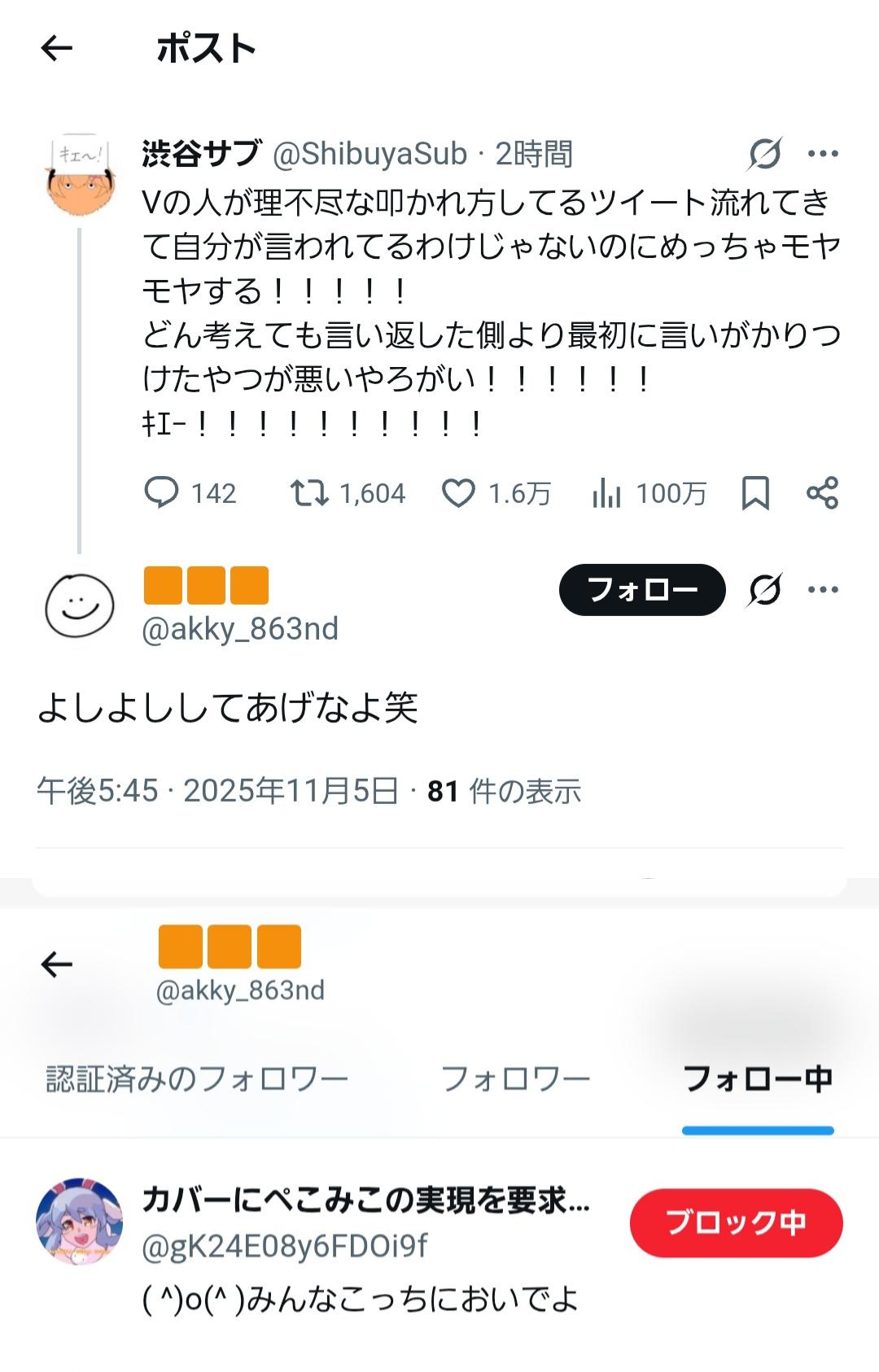 | … | 42無題Name名無し 25/11/01(土)04:34:00No.1907352そうだねx48>言い方が妙にチクチクしてるしサブ垢ばっかりフォローしてるな? |