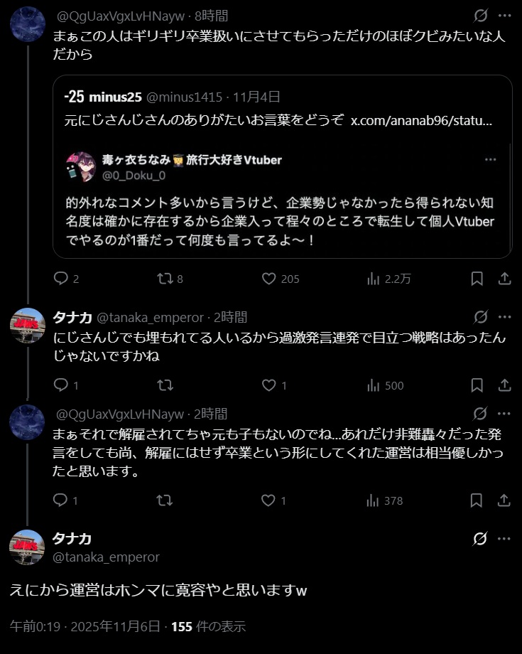 | … | 1971無題Name名無し 25/11/07(金)08:32:42No.1909617+昔はにじの卒業配信は異常に数字出てにじリスはにじには卒業推しがいるんだと言い訳してたけど |