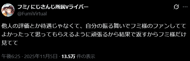 | … | 1924無題Name名無し 25/11/06(木)23:37:35No.1909565+Q「視聴を通じたファンとの絆を重視っていうけどそれを確認できる指標とかKPIの開示しないの?」 |