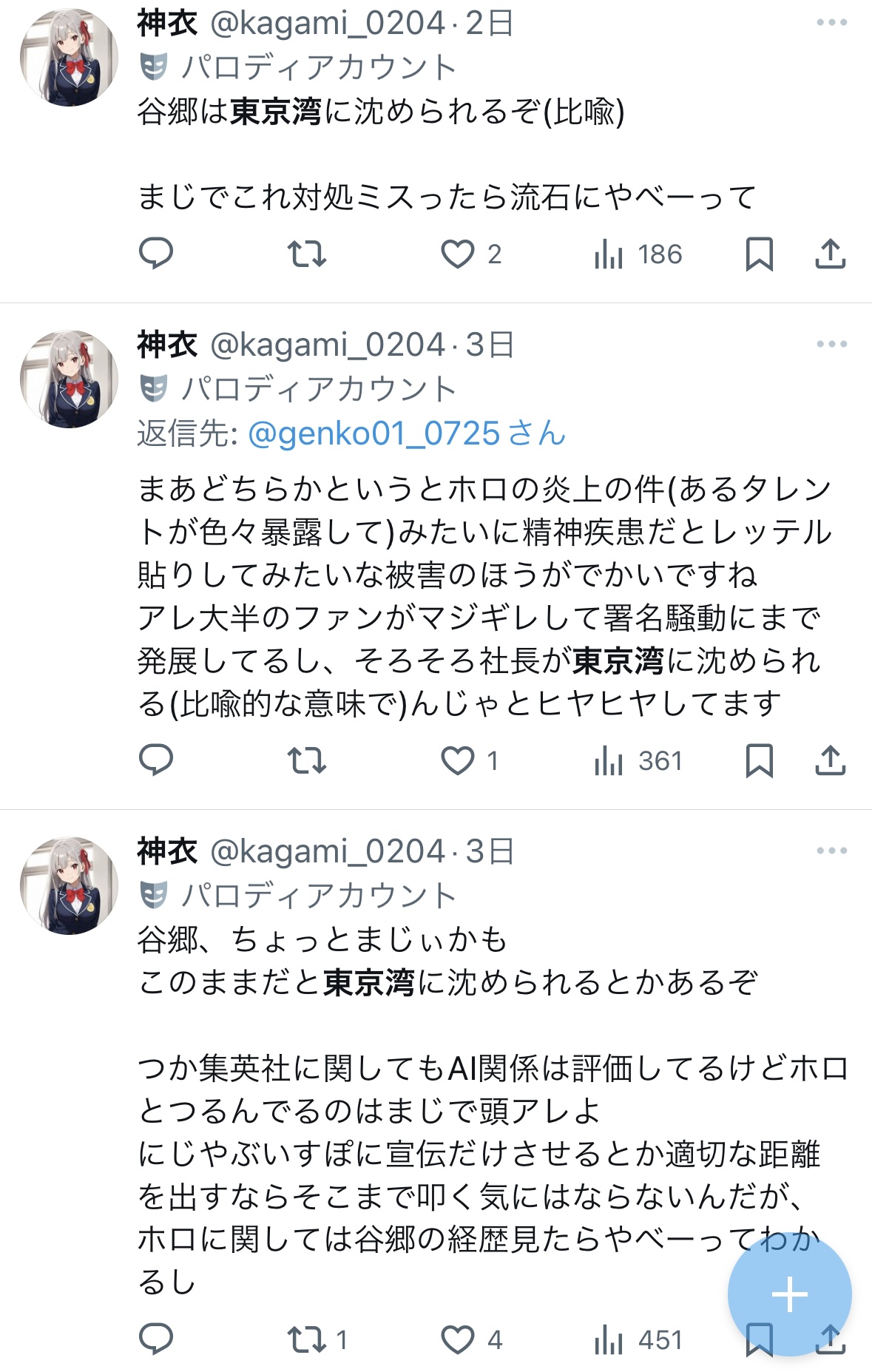 | … | 22無題Name名無し 25/11/01(土)02:49:36No.1907330そうだねx1やるなら垢消して逃げるべきなんじゃないですかね |