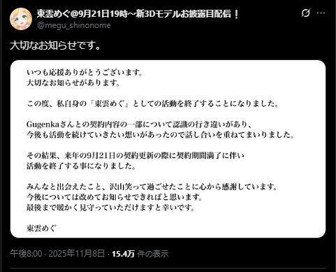 | … | 32無題Name名無し 25/11/10(月)21:54:55 IP:126.147.*(bbtec.net)No.1911298+IPを継続して保持するだけでVtuberとして2代目を立てる予定はないって説明はさっき「東雲めぐ」からしていて |