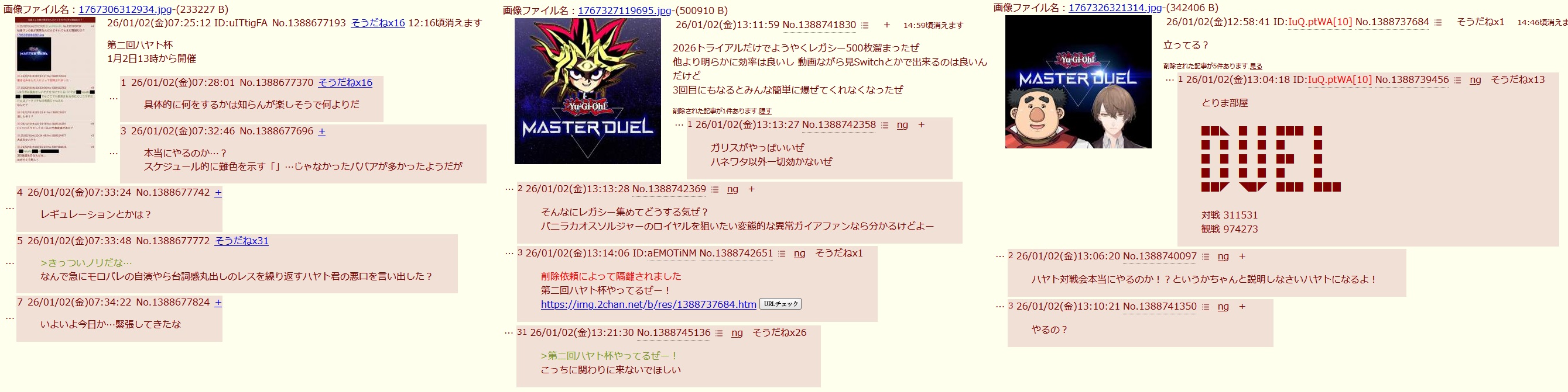| … | 29無題Name名無し 26/01/02(金)16:03:20No.1933474そうだねx4>imgの遊戯王DMスレにてメアドを誤爆したV粘着をハヤトだと呼び始め、1/2に二度目の大会を開催 |
