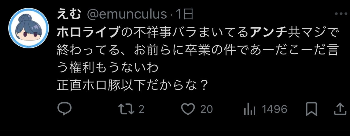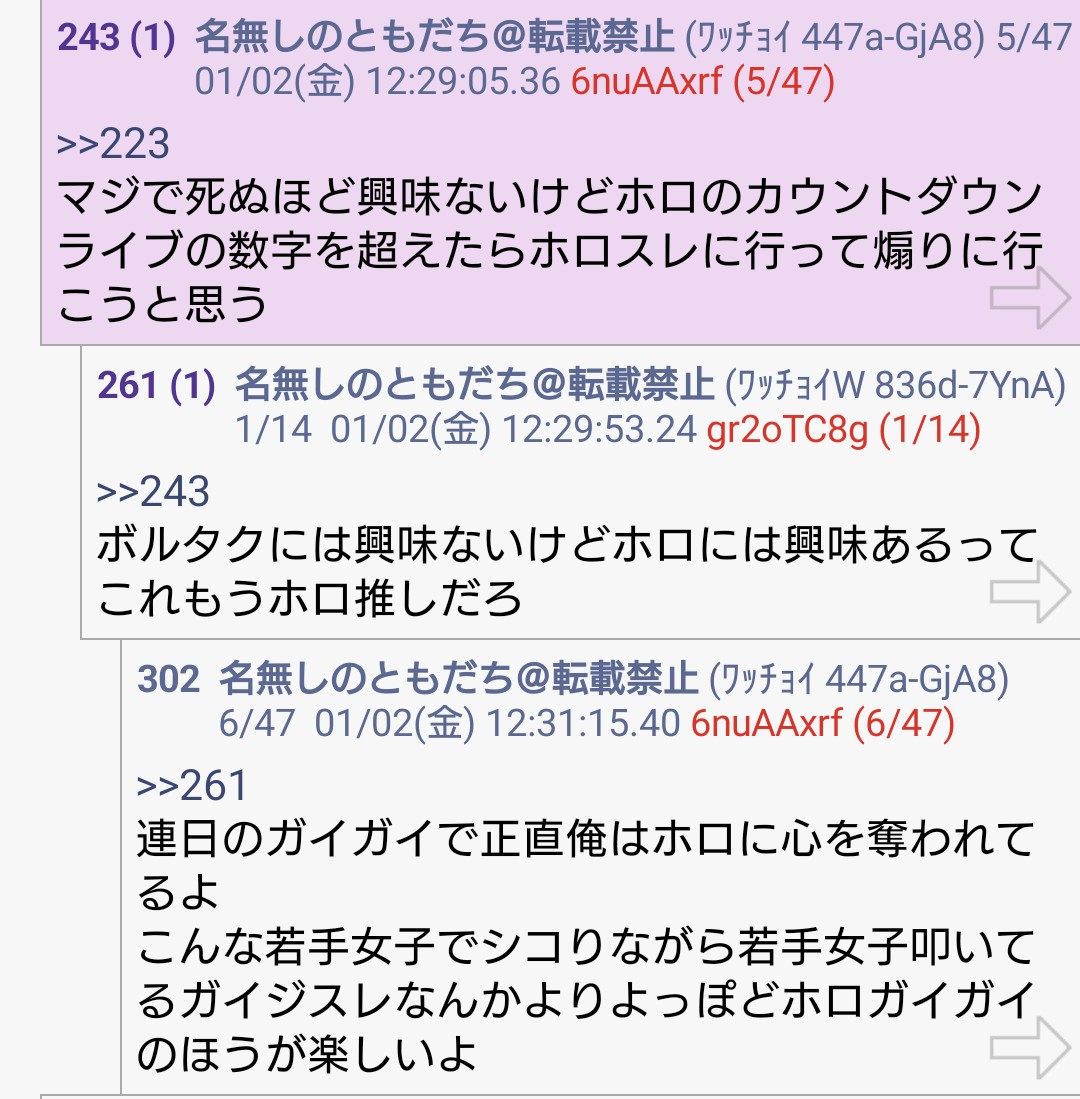 | … | 1460無題Name名無し 26/01/09(金)00:20:01No.1935270そうだねx14>いもげで中国人バレしたホロアンチもそうだけど何でそんな国籍バレると焦るんだろうな |
