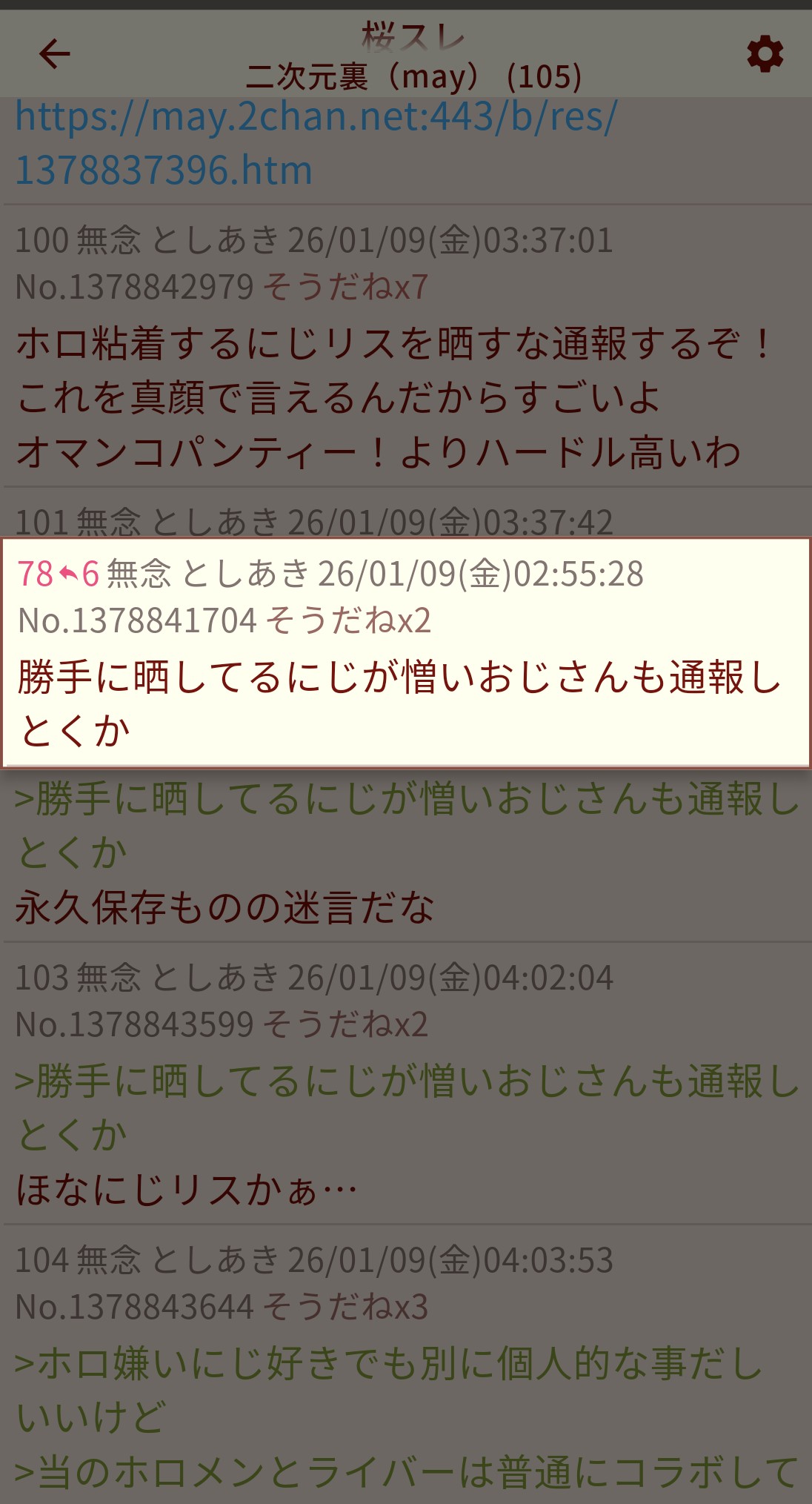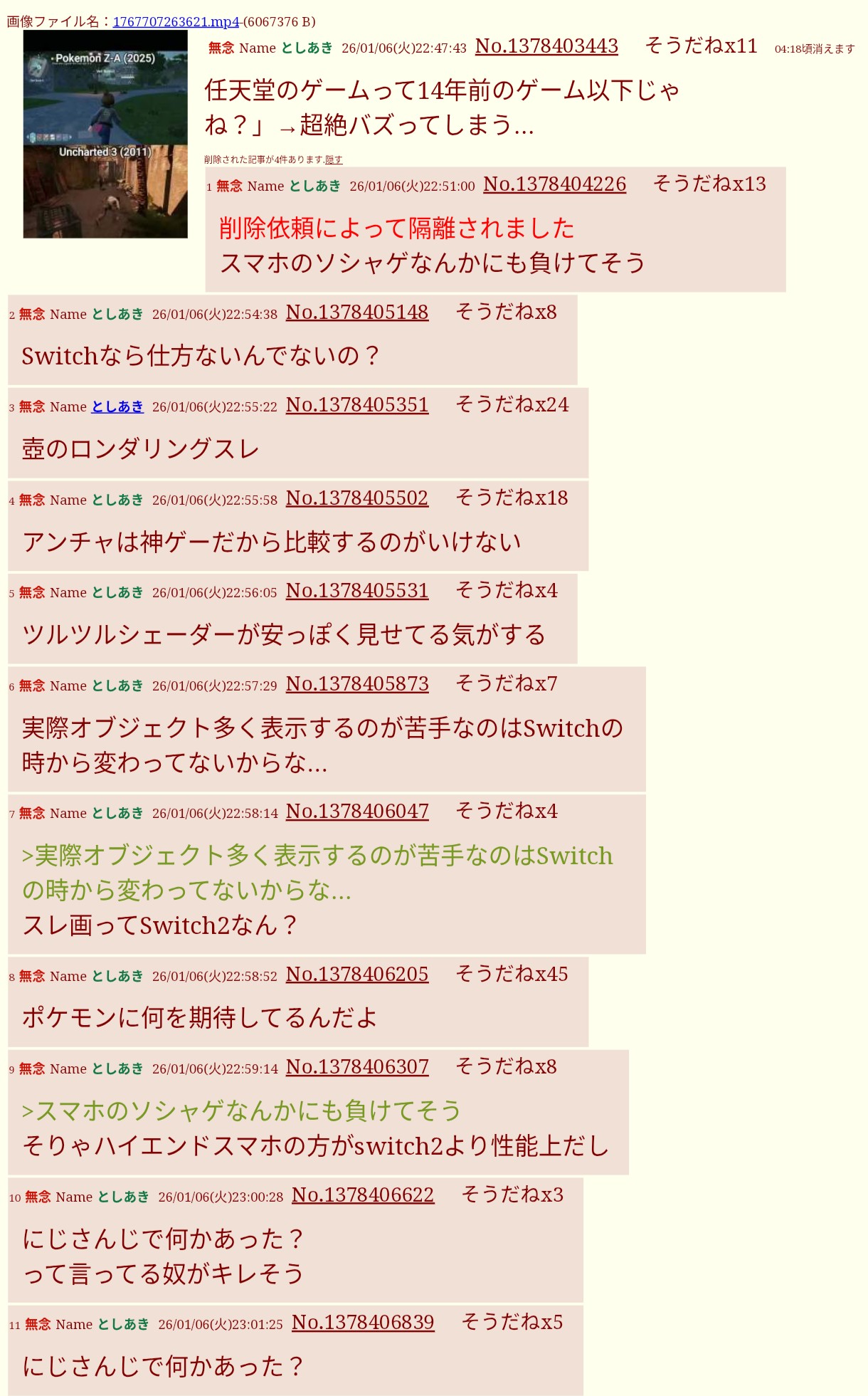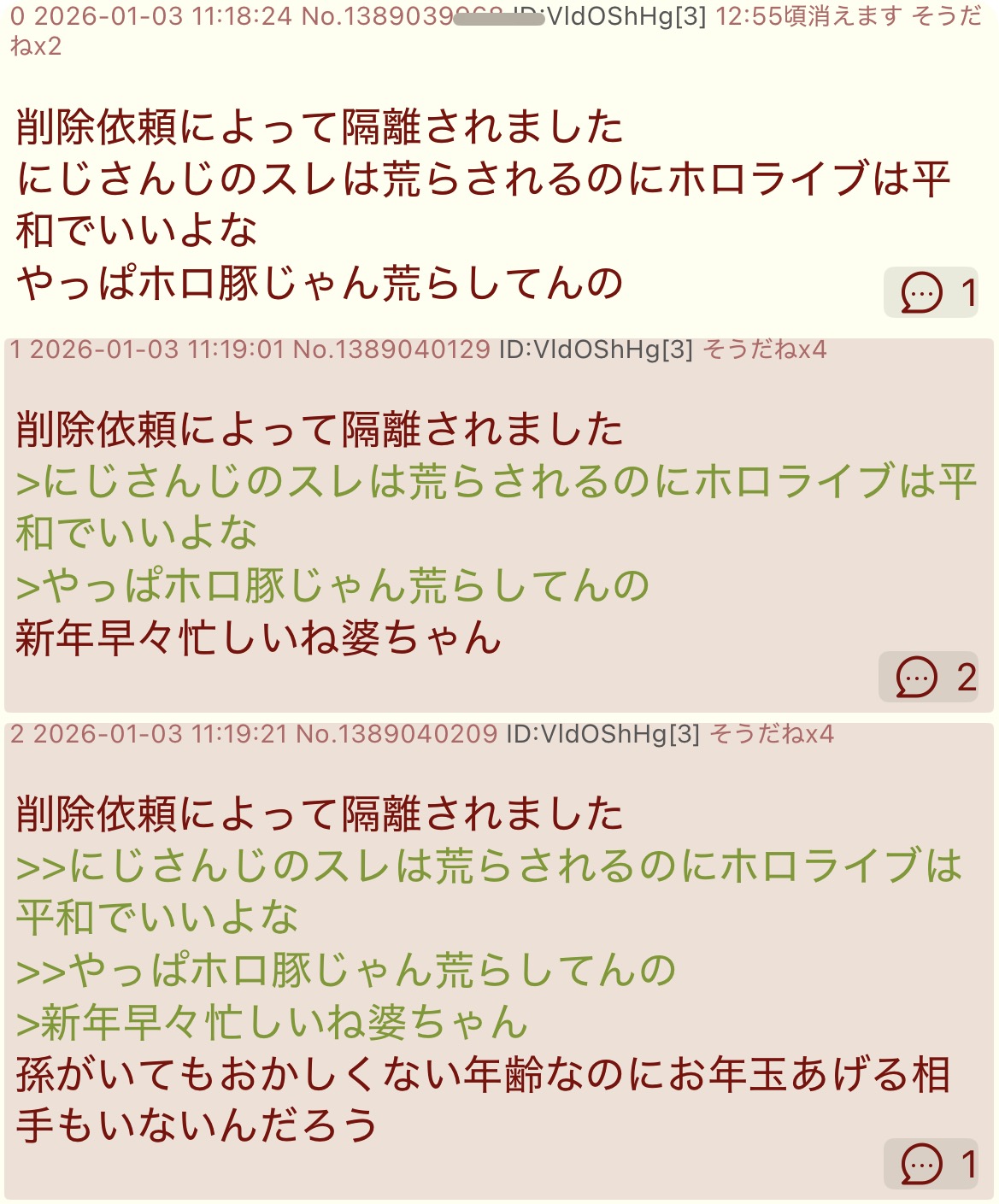 | … | 78無題Name名無し 26/01/02(金)21:07:34No.1933535そうだねx11>単に品のない挨拶したいつもの冷笑コンテンツってだけのことに反社呼びはにじリスの才能あるよ |