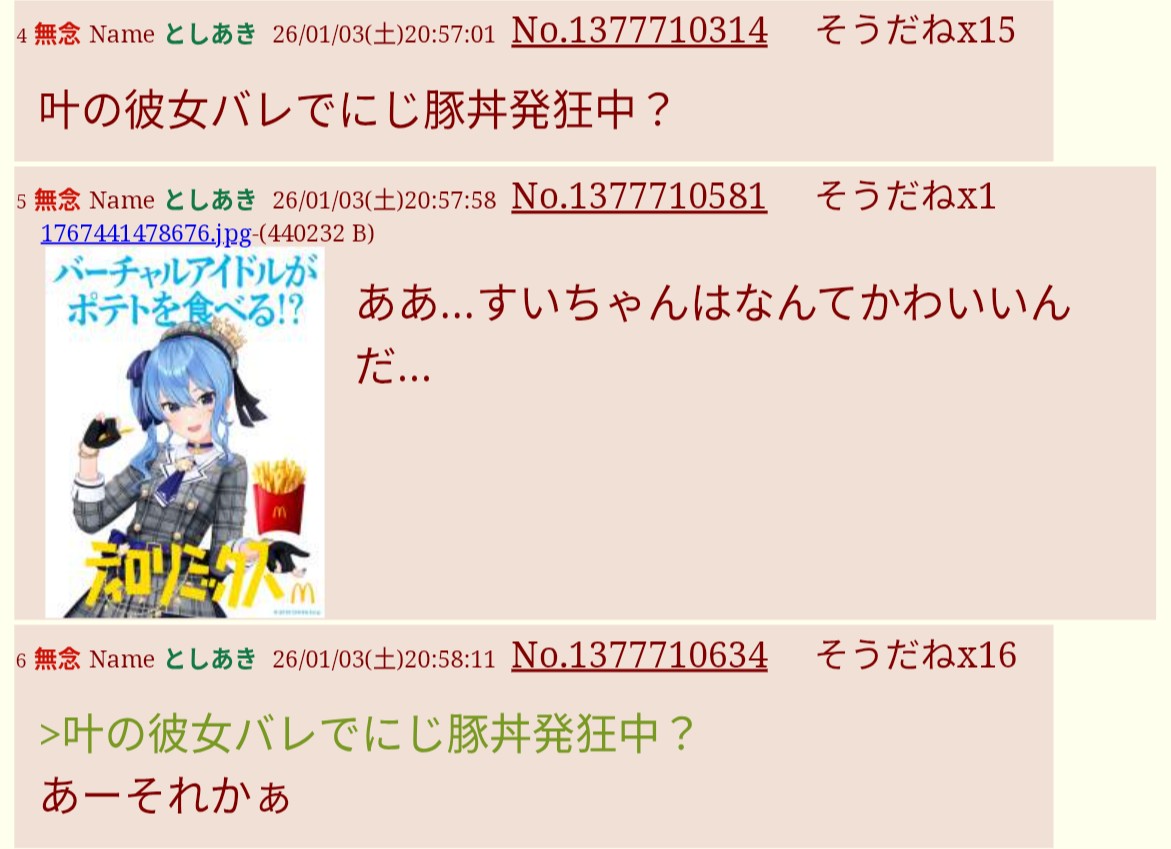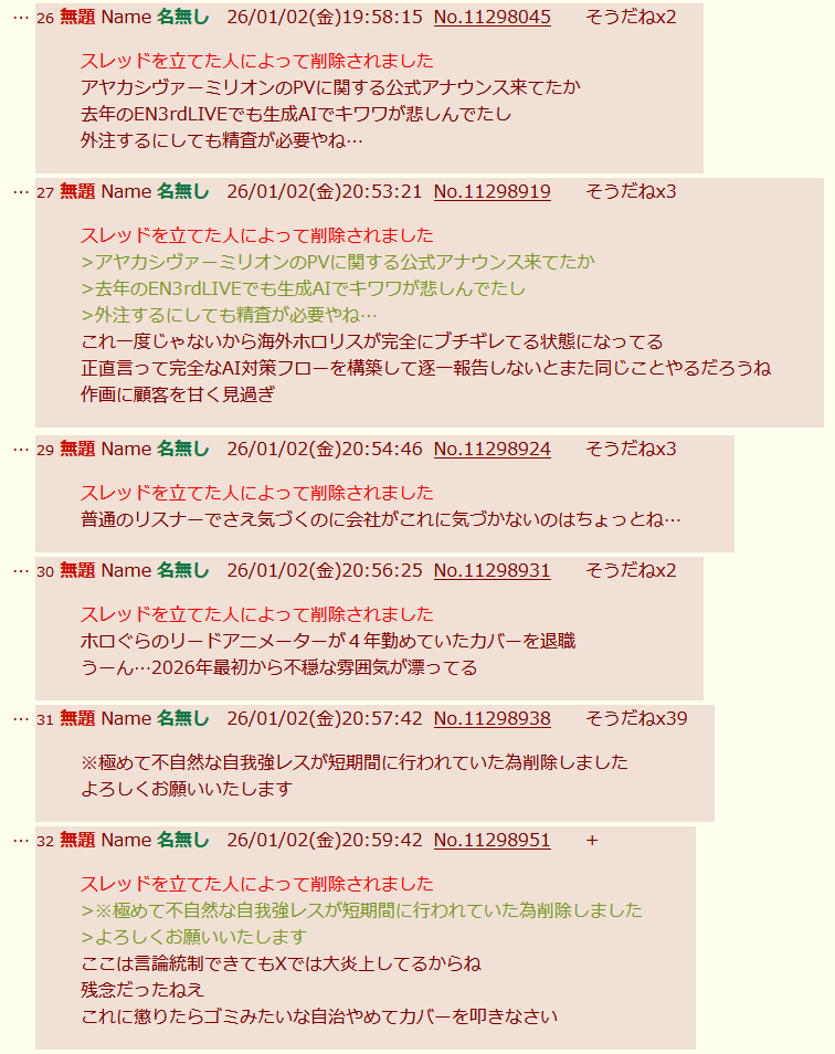 | … | 40無題Name名無し 26/01/02(金)17:28:09No.1933488そうだねx6そもそもにじさんじ単独且つ提供されてるコンテンツの話題で埋められない時点でな |