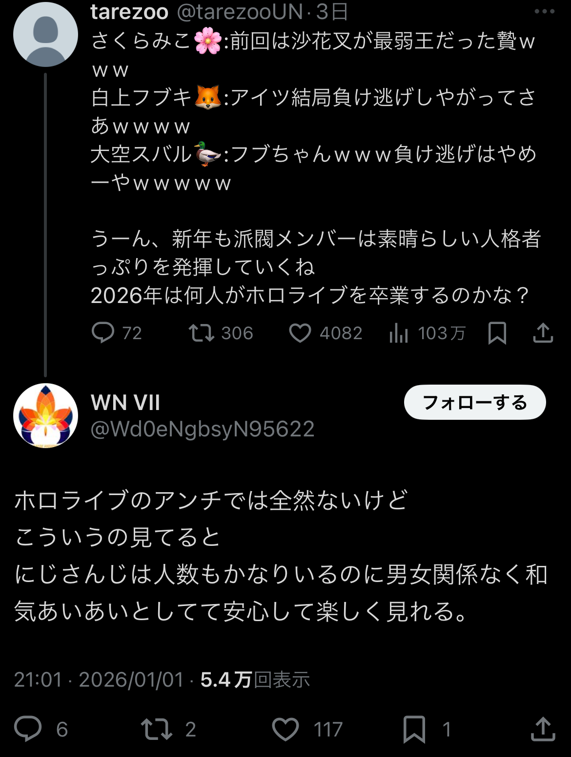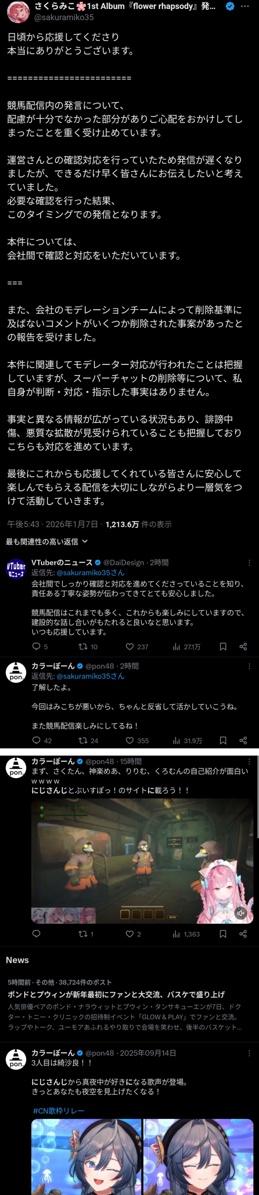 | … | 81無題Name名無し 26/01/02(金)21:08:48No.1933538そうだねx19まー他所だったらアホほど燃やされてただろうから世界はにじさんじに優しいですねとしか |