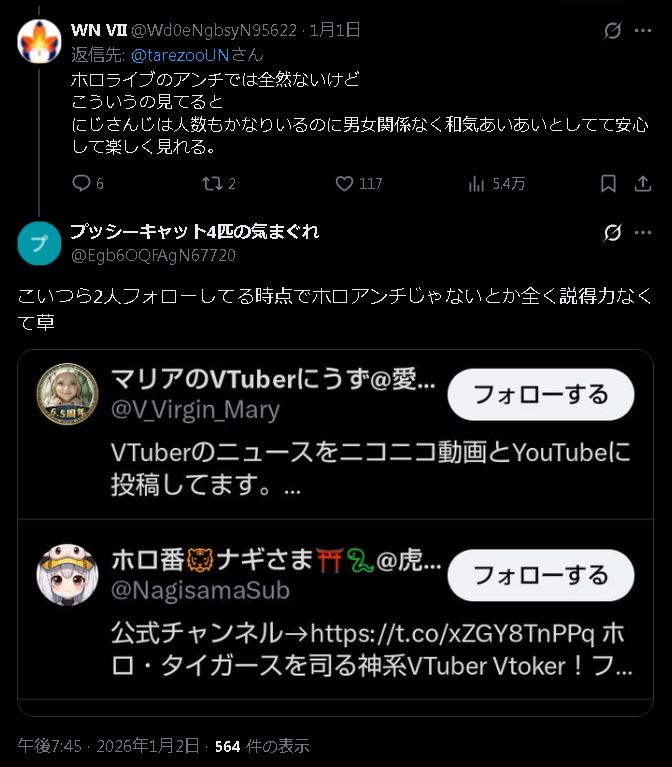 | … | 48無題Name名無し 26/01/02(金)18:28:31No.1933500そうだねx19>そもそもにじさんじ単独且つ提供されてるコンテンツの話題で埋められない時点でな |