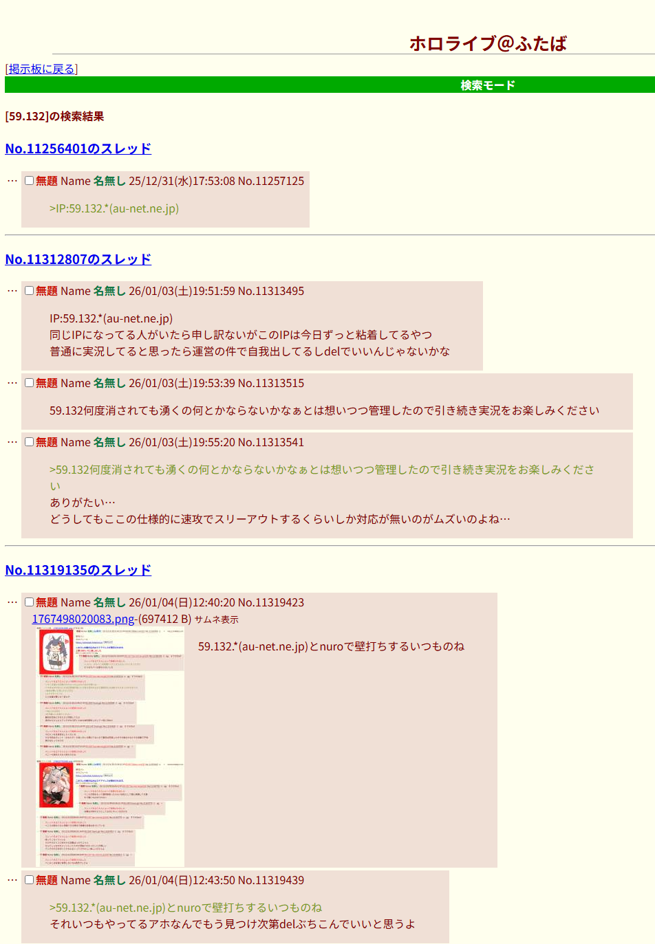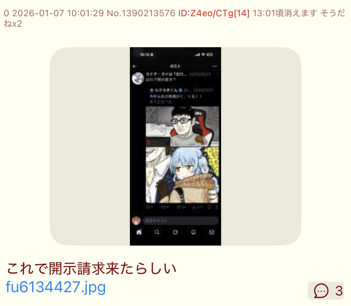 | … | 68無題Name名無し 26/01/02(金)20:54:45No.1933525そうだねx8またにじリスが自演してる |