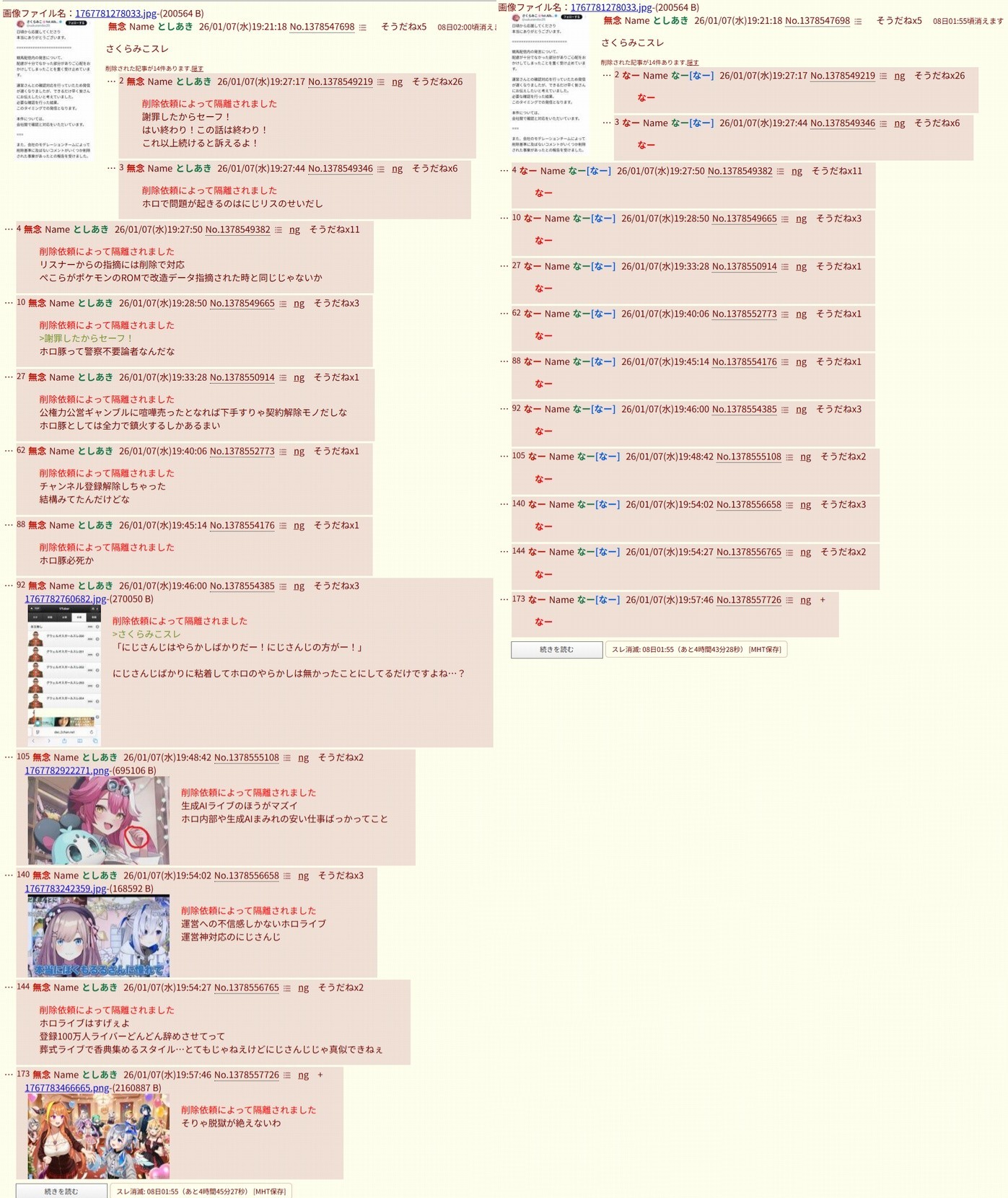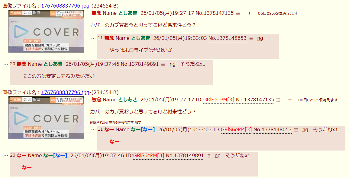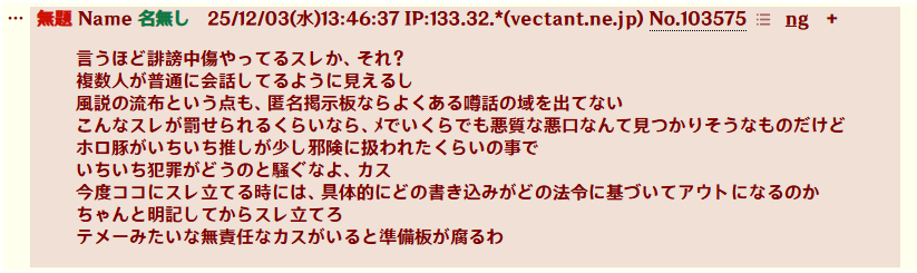 | … | 3無題Name名無し 26/01/02(金)14:00:35No.1933448そうだねx2にじさんじ運営会社ANYCOLORによる違法疑いの行為等が確認された場合は上記通報先に加えて以下にも通報を |