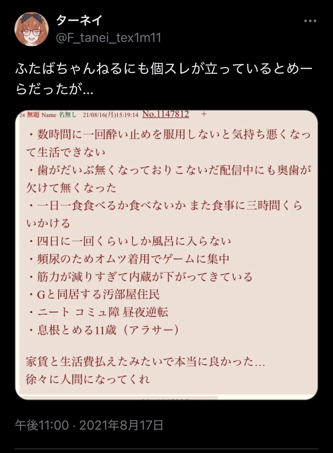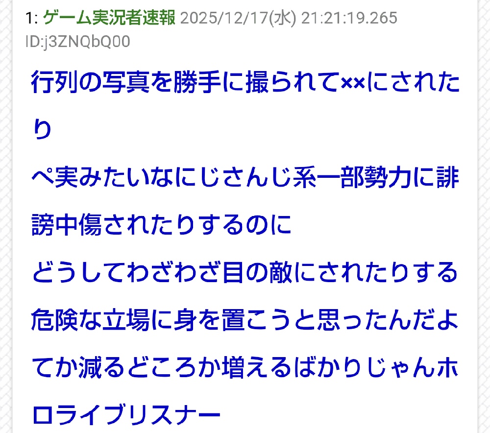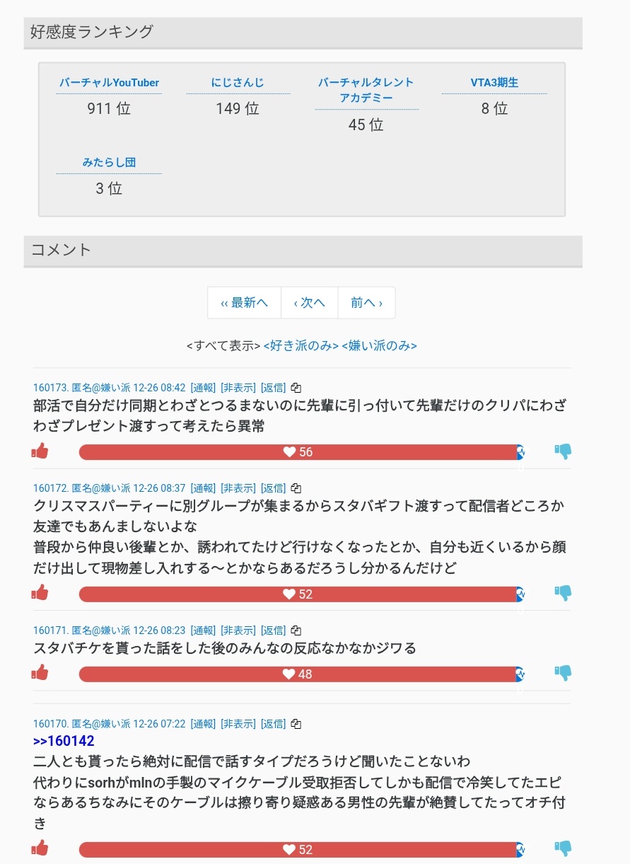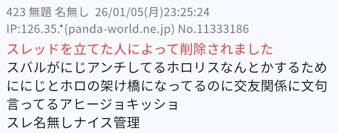 | … | 10無題Name名無し 26/01/02(金)14:04:51No.1933455そうだねx3※このスレはにじさんじの運営、ライバー、リスナーの迷惑行為や道徳に反する行動を収集するスレです |