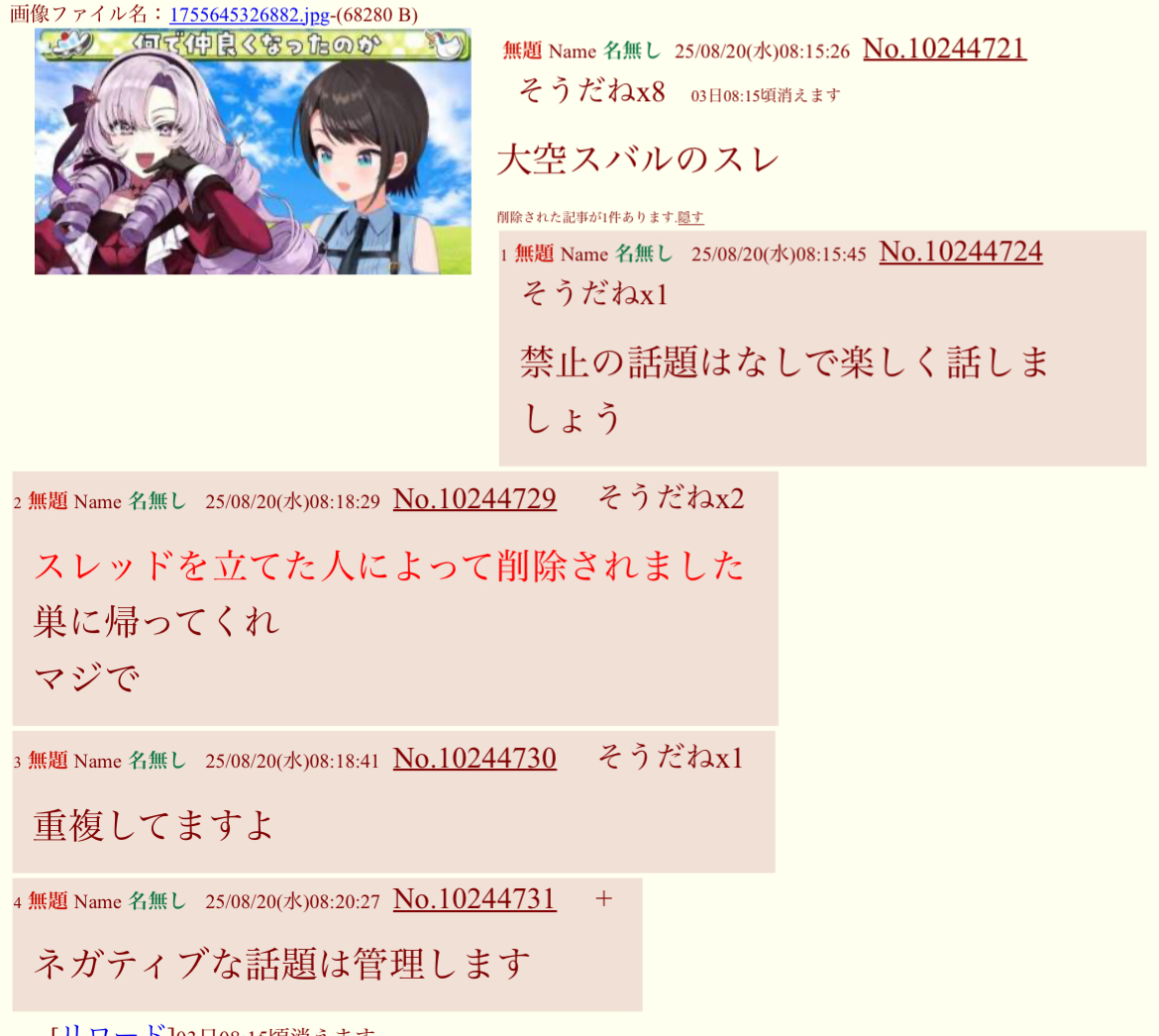 | … | 1468無題Name名無し 26/01/09(金)00:29:28No.1935278そうだねx7 1767886168145.webp-(540616 B) >「思想の自由市場」(意味:にじさんじなかよし掲示板・通称有ンスレ) |