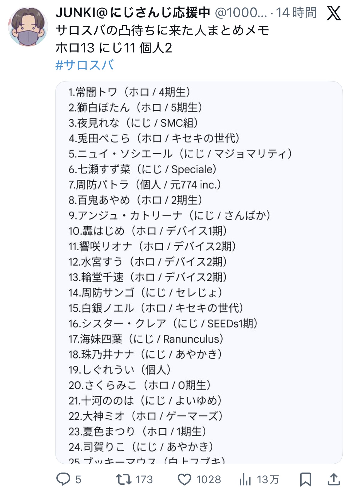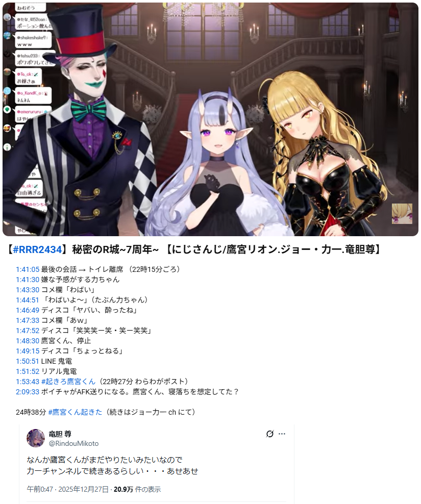 | … | 11無題Name名無し 26/01/02(金)14:05:05No.1933456そうだねx4・クリスマス企画のにじサンタにて渋谷エリアの人通りが少なく狭い場所に配置した影響により、リスナーが通行人に暴言を吐かれたことが報告される |