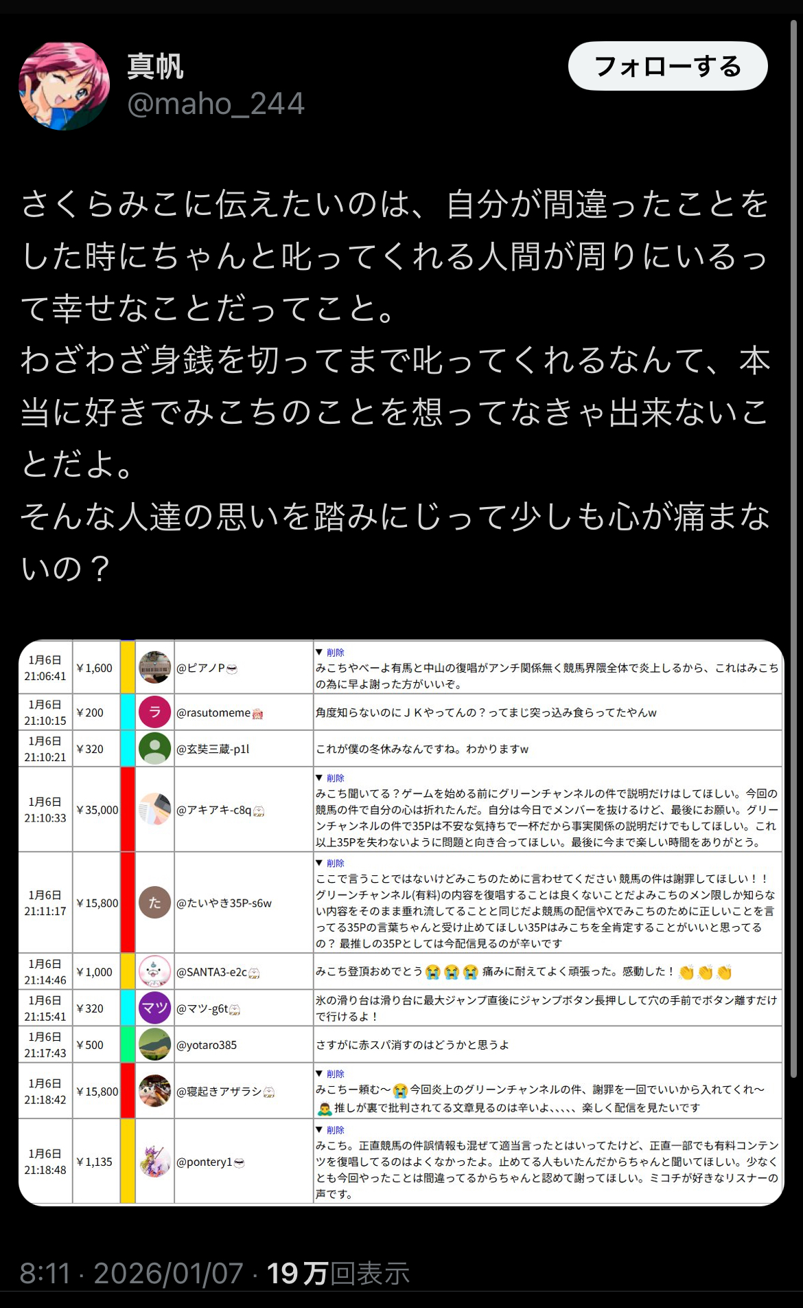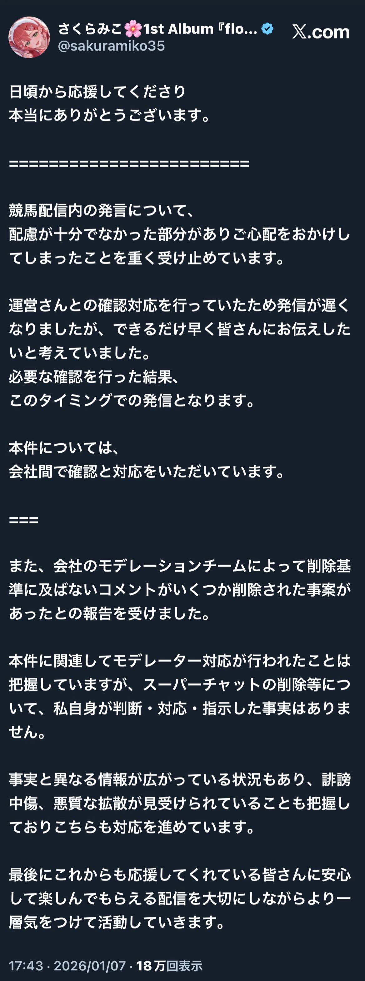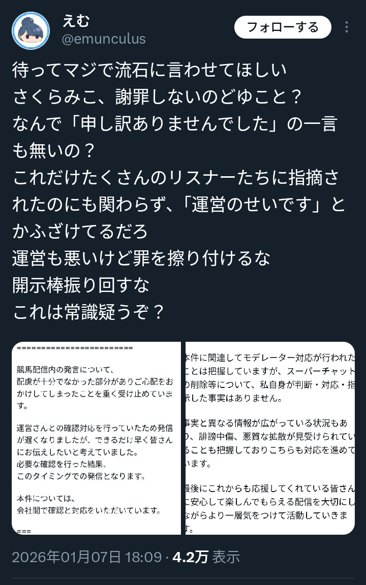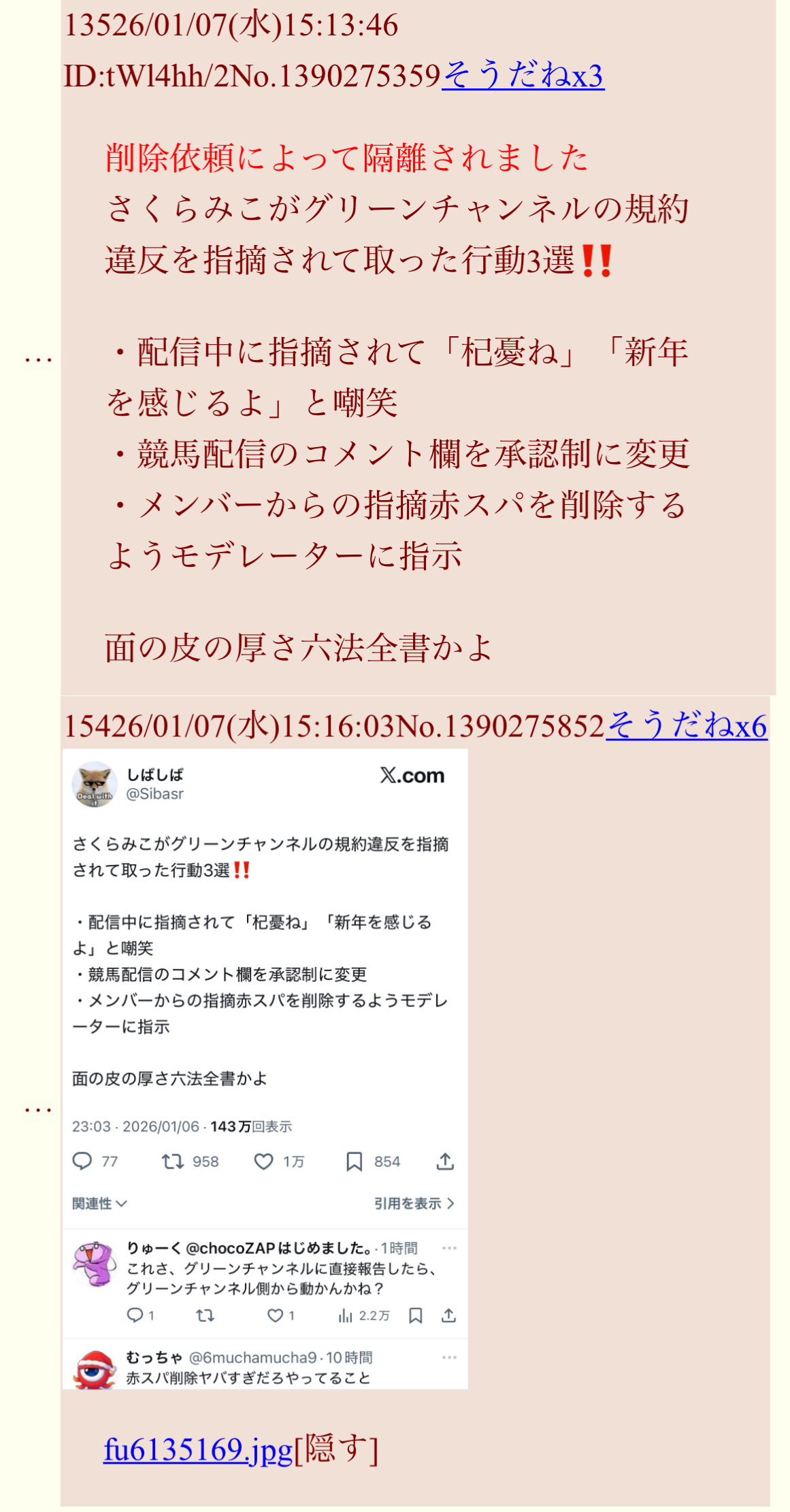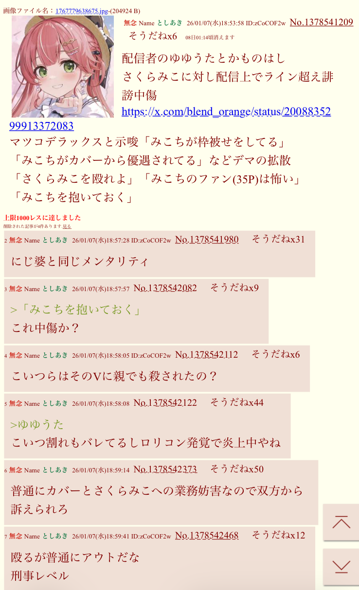 | … | 1520無題Name名無し 26/01/09(金)12:02:00No.1935337そうだねx10さくらみこ放火炎上の件はにじリスがやったことだとグリーンチャンネルとJRAにしっかり連絡入れた方がいいよな? |