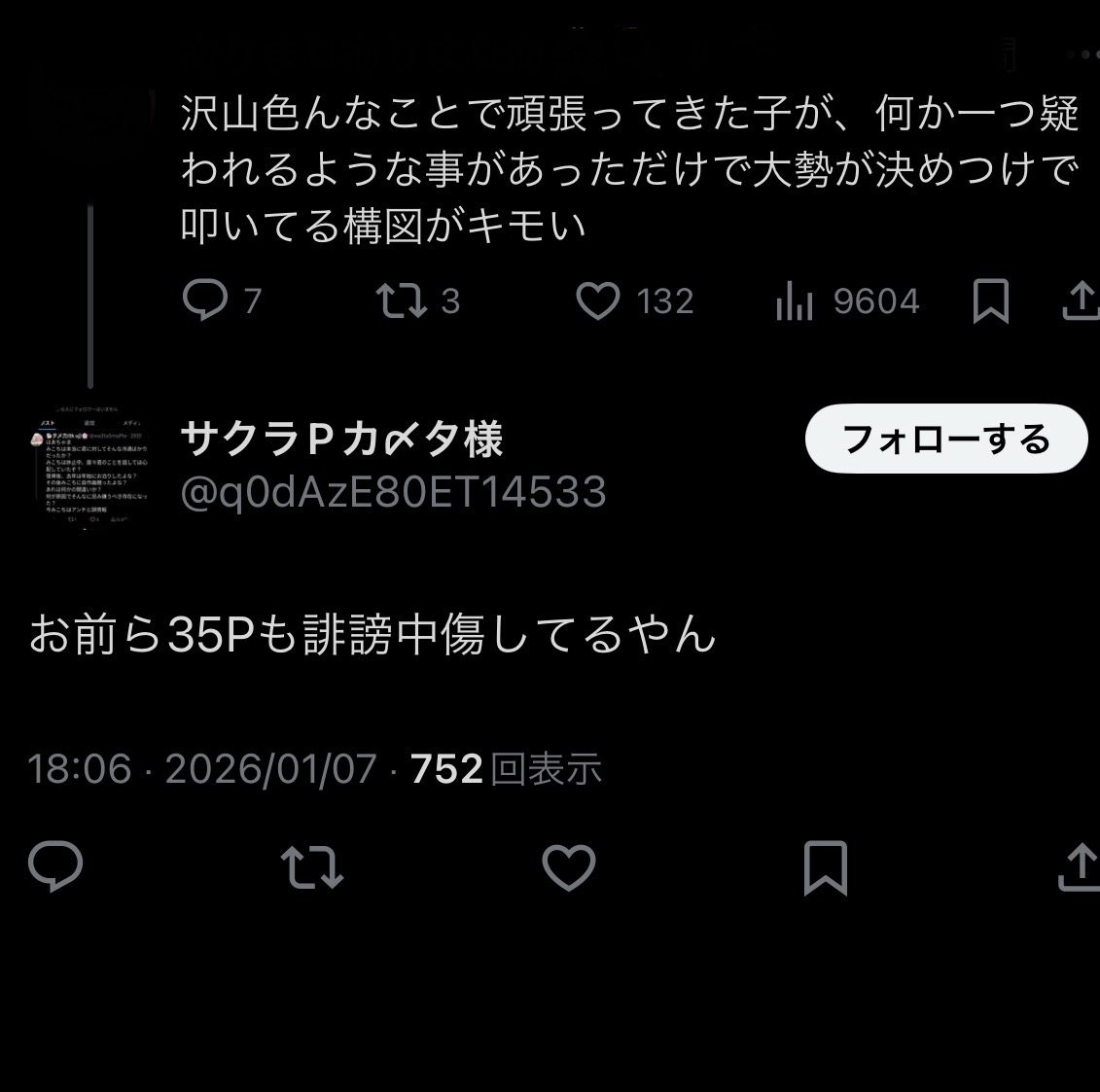 | … | 1495無題Name名無し 26/01/09(金)06:11:13No.1935308そうだねx1気配とかはお前の思い込みで済ませれるが🦐として引用拡散される形は許されんから垢ごと逝ったんだろ |