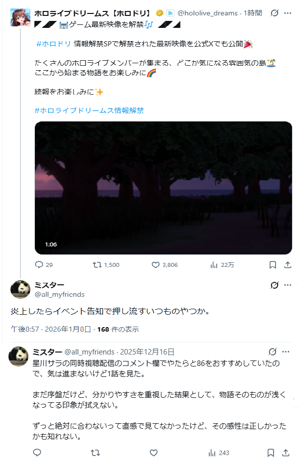 | … | 44無題Name名無し 26/01/02(金)17:40:23No.1933493+数字誇ってるわりににじが周りで全く話題にならないのはなぜなんでしょうね |
