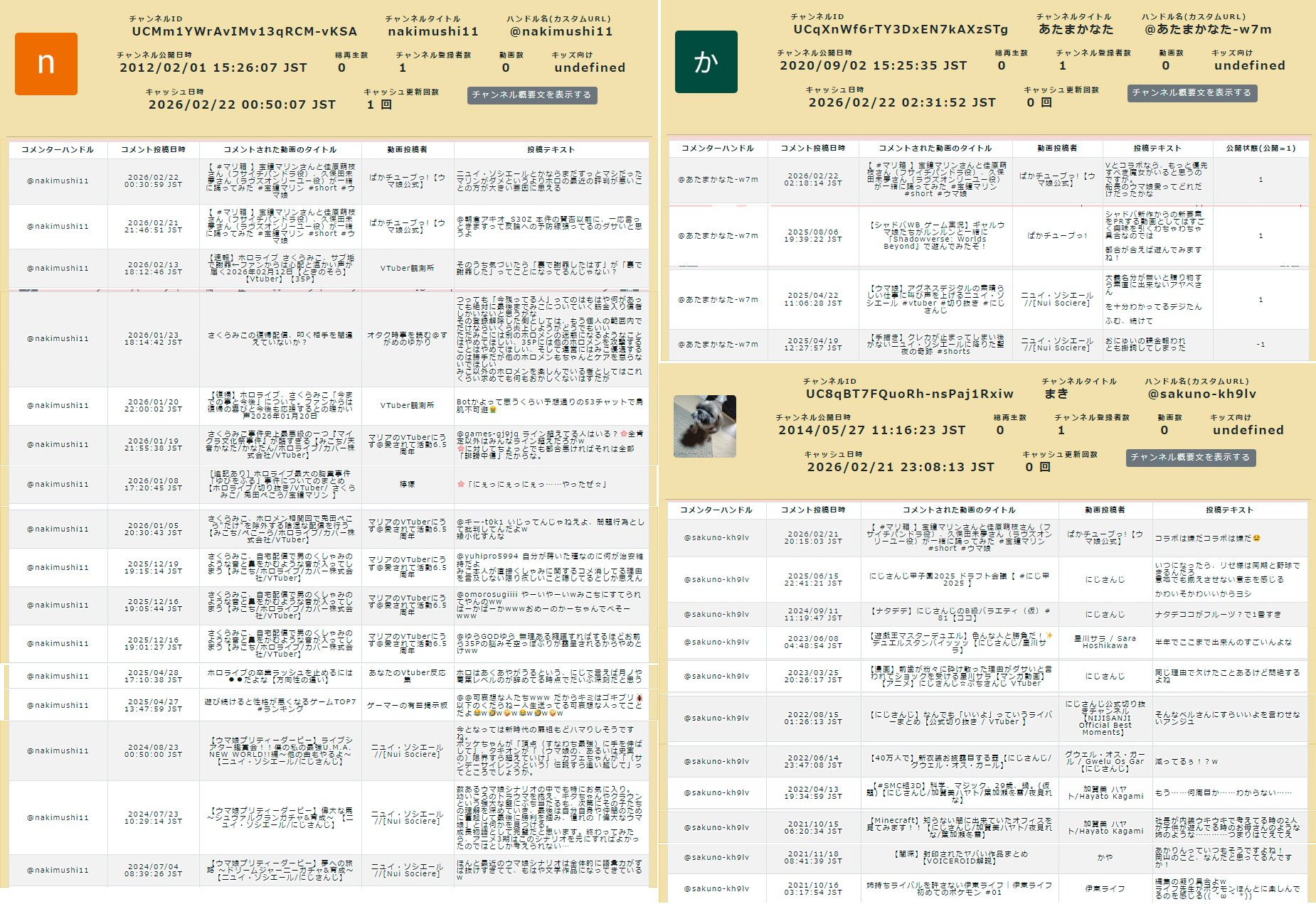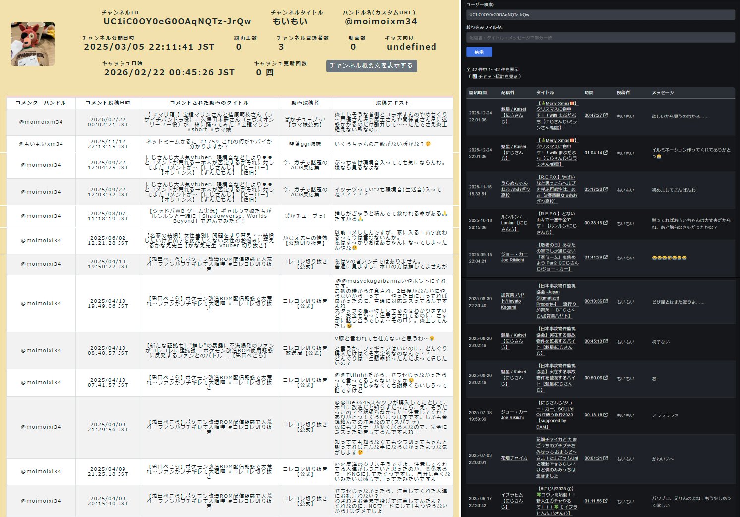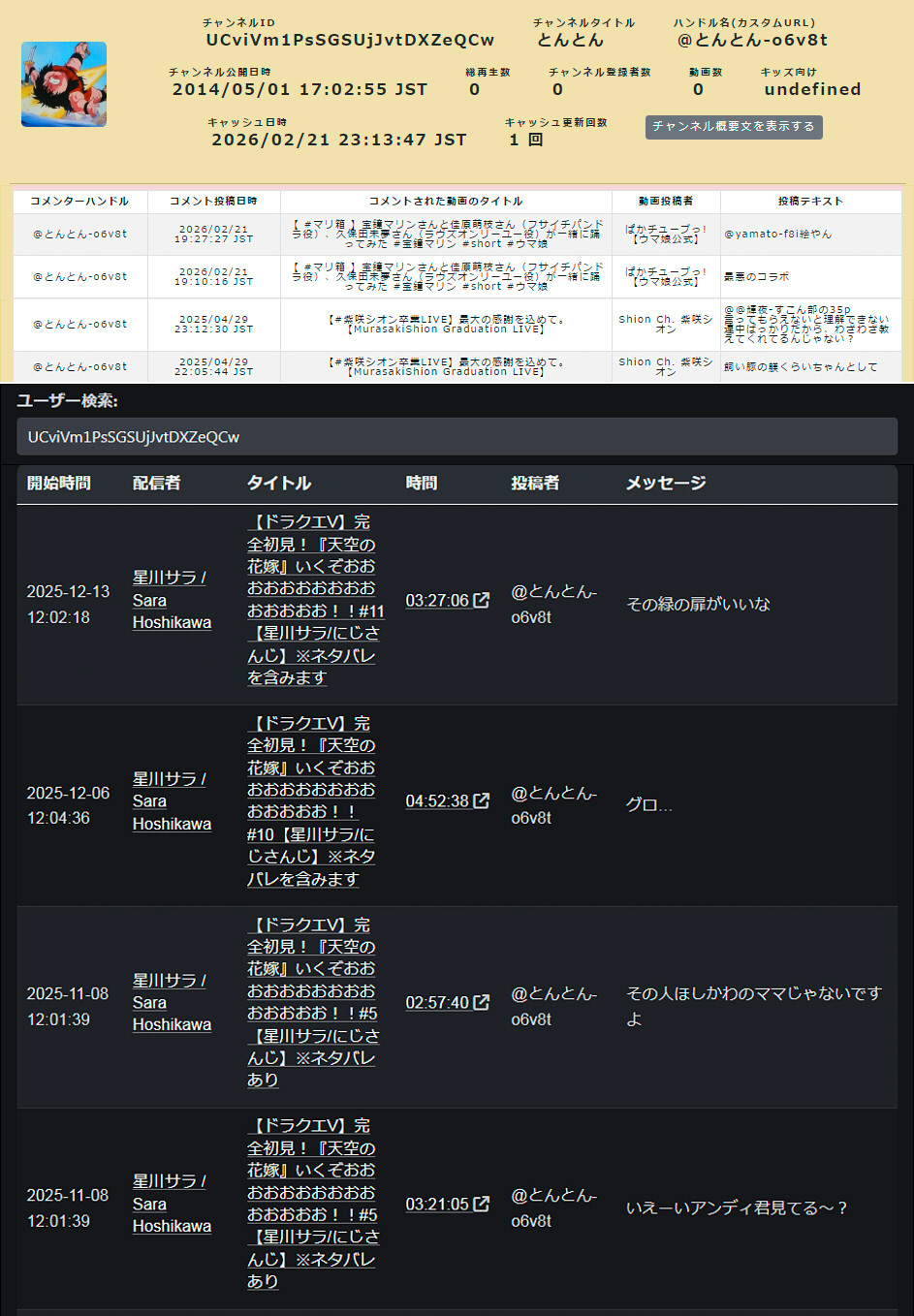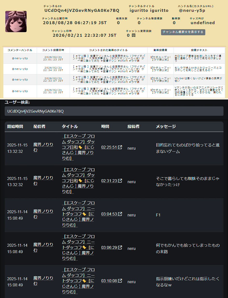 | … | 6無題Name名無し 26/02/22(日)21:59:38No.1950787そうだねx7 1771765178082.png-(87130 B) ■動画のコメント検索をしたり、過去のコメントを見れるサイト |