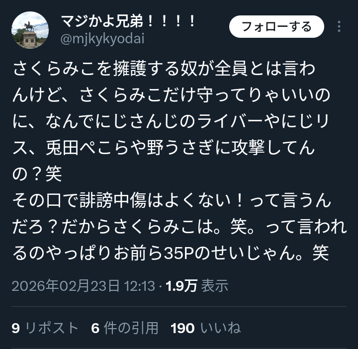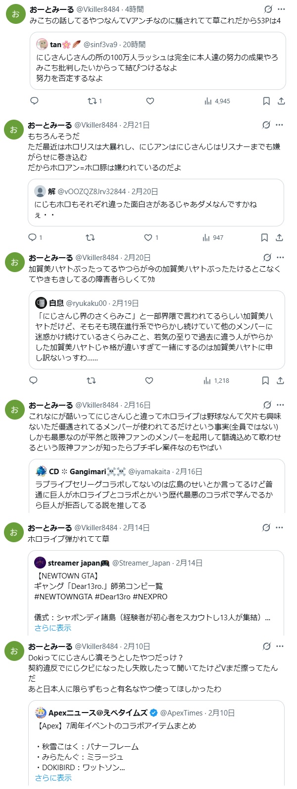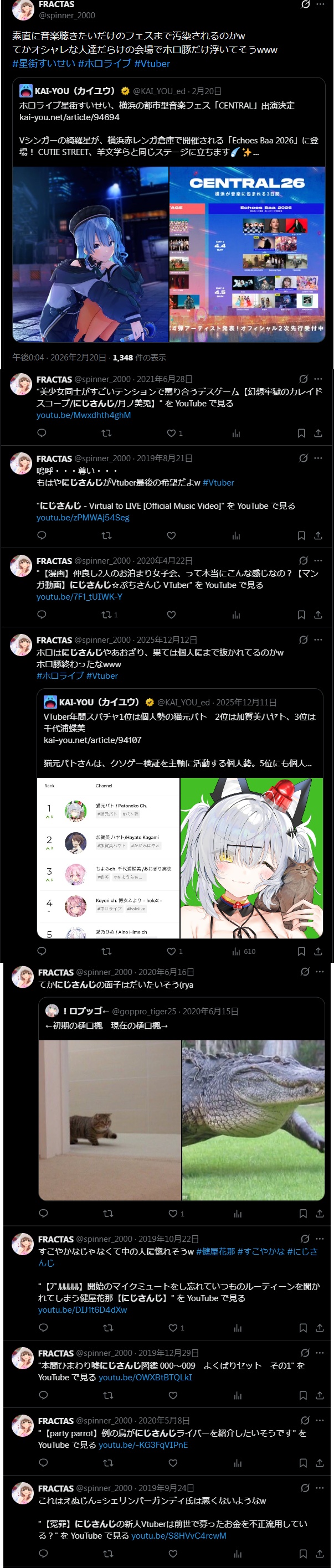 | … | 76無題Name名無し 26/02/23(月)03:14:19No.1950876そうだねx26Vtuber自体が嫌いなタイプからはホロライブだけじゃなく普通ににじさんじも嫌われてること本当に認めたくないんだな |