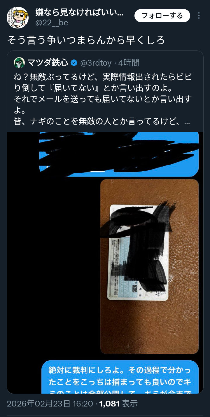 | … | 11無題Name名無し 26/02/22(日)22:10:25No.1950794そうだねx17 1771765825569.png-(311062 B) これ嘘だったら脅迫だよね |
