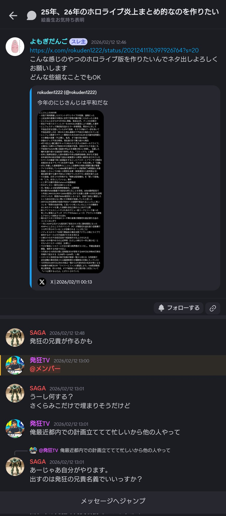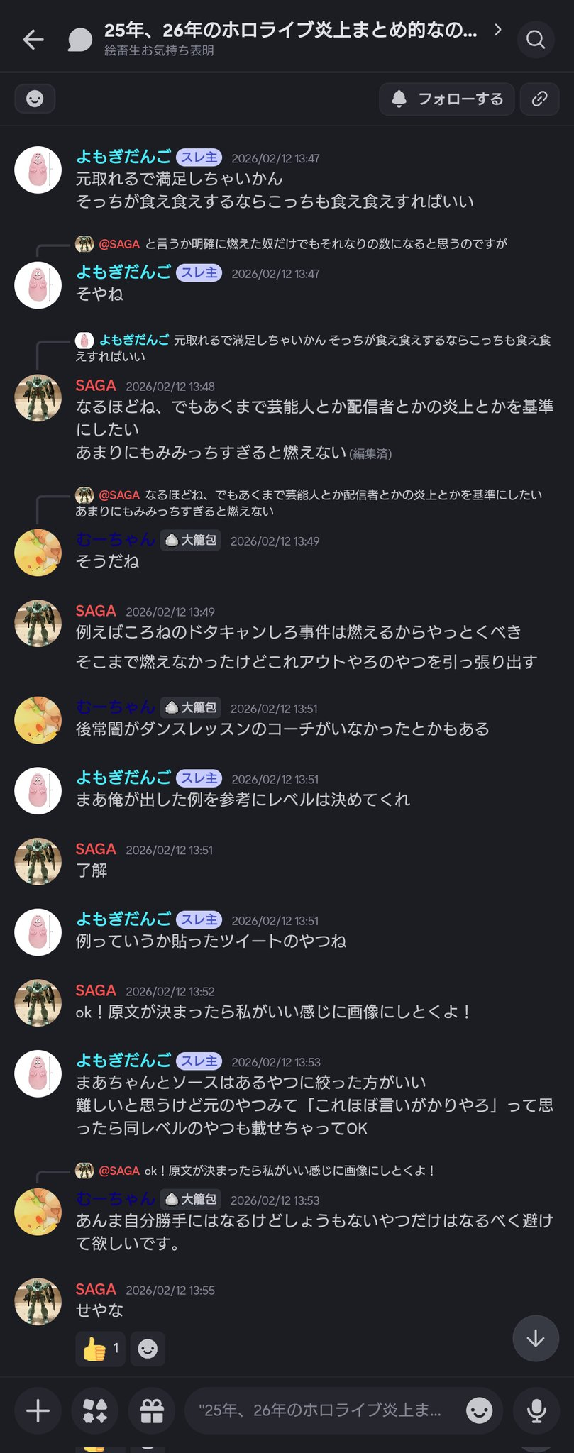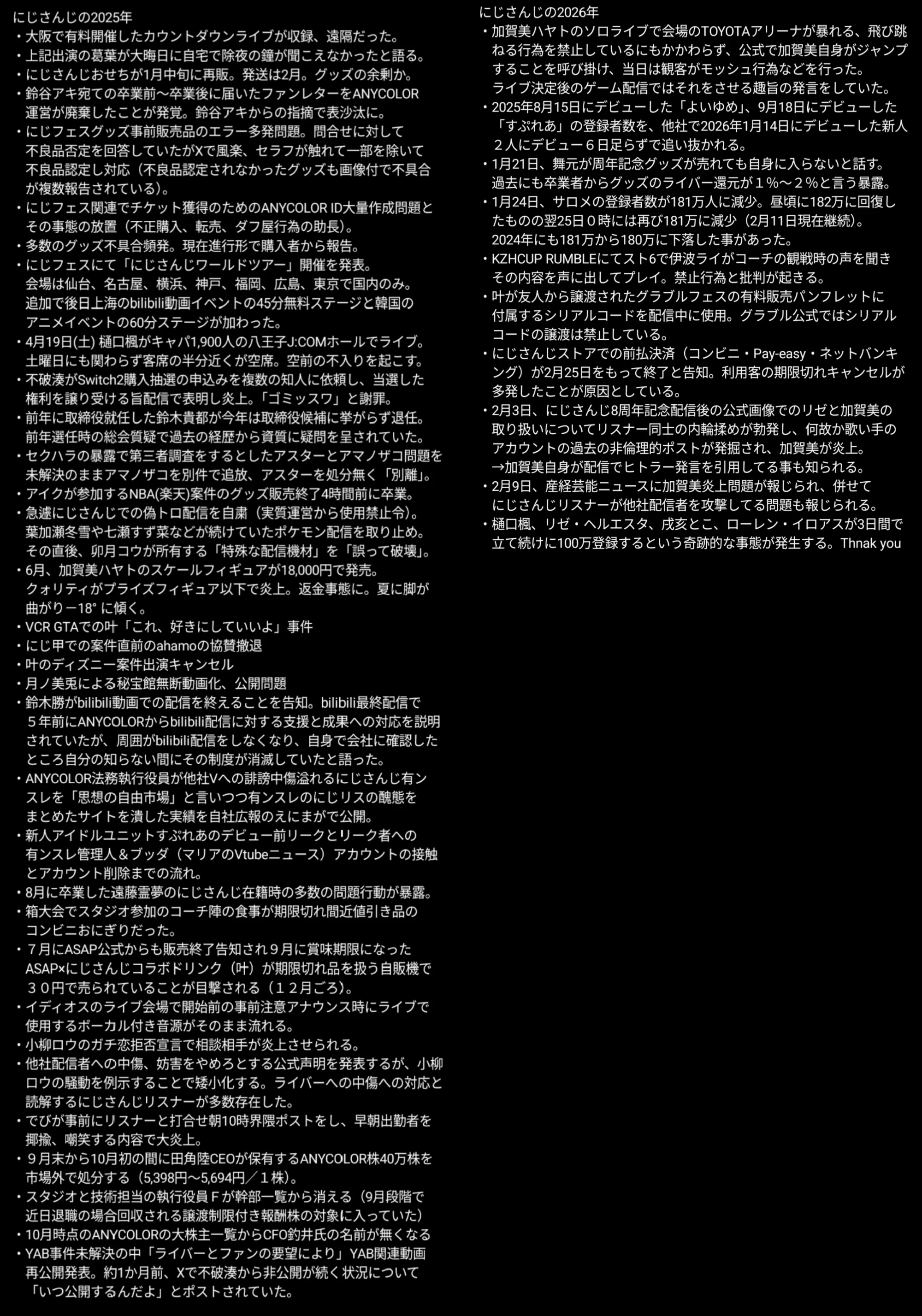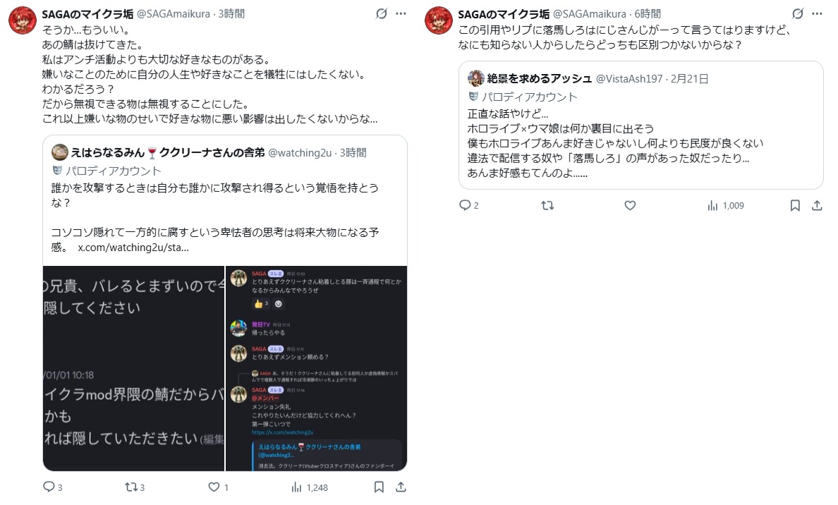 | … | 8無題Name名無し 26/02/22(日)22:00:51No.1950789そうだねx6※このスレはにじさんじの運営、ライバー、リスナーの迷惑行為や道徳に反する行動を収集するスレです |