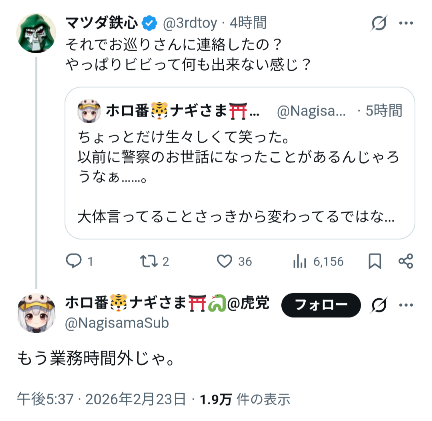 | … | 33無題Name名無し 26/02/22(日)23:18:05No.1950822+>「えにからの法務が日曜日に動くわけがない」って認識がありとあらゆるコミュニティで共有されてるの |