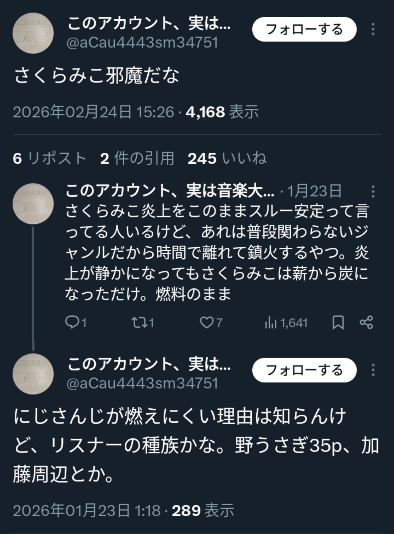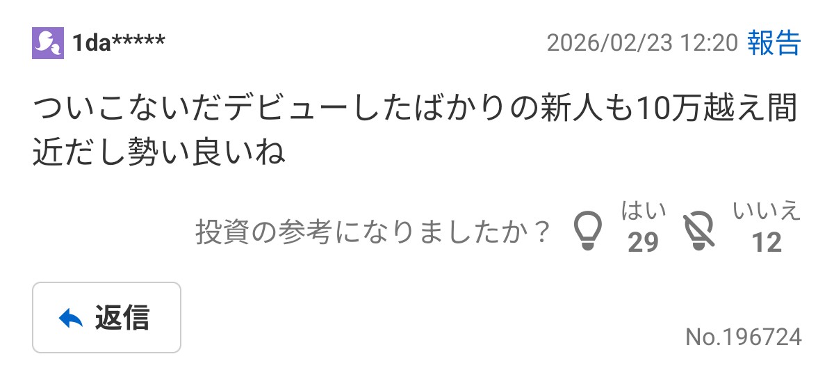 | … | 65無題Name名無し 26/02/23(月)01:04:13No.1950861そうだねx14むしろ復帰する前のほうがちゃんとライブやったりして配信活動と音楽活動の両立して成長できてたのではと思う |