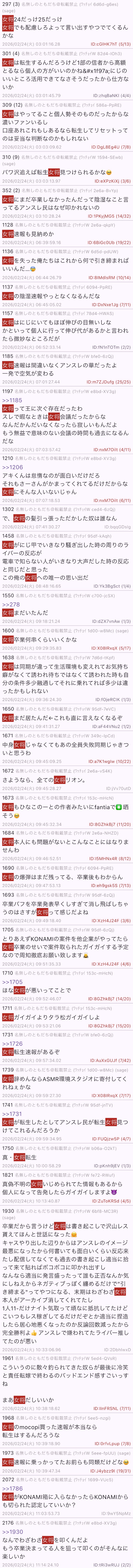 | … | 56無題Name名無し 26/02/23(月)00:13:23No.1950849+そもそも既存メンバーでも適応障害で強制的に卒業させてる状態なのに何で採用されるという考えが出てくるのか |