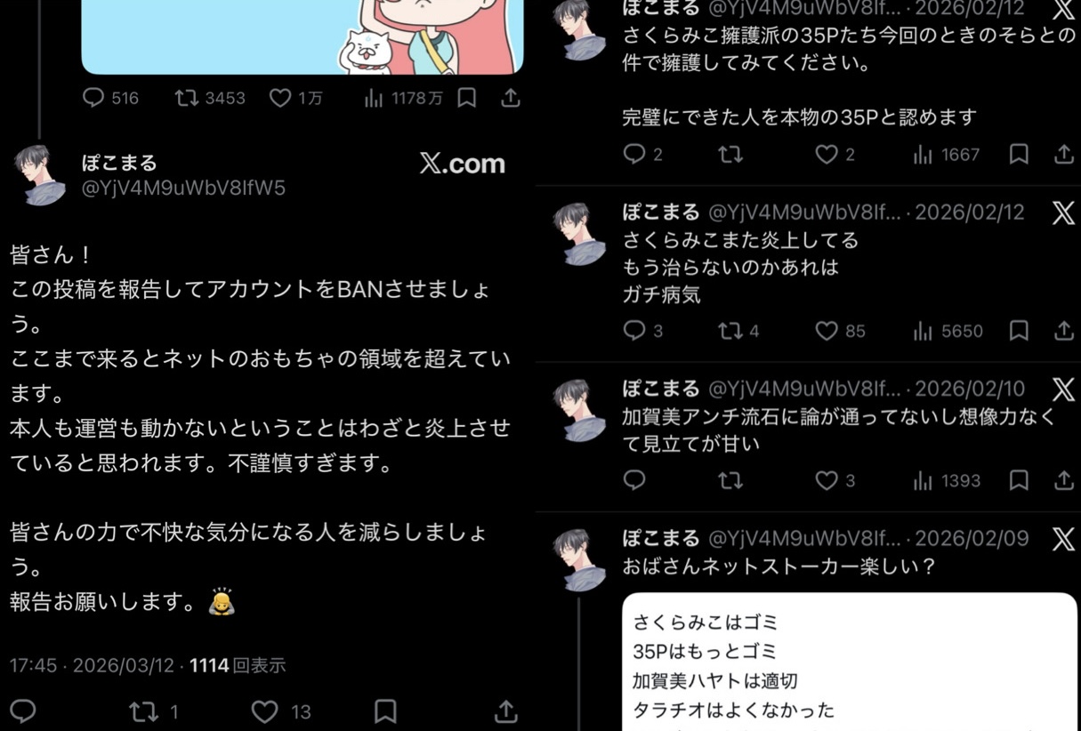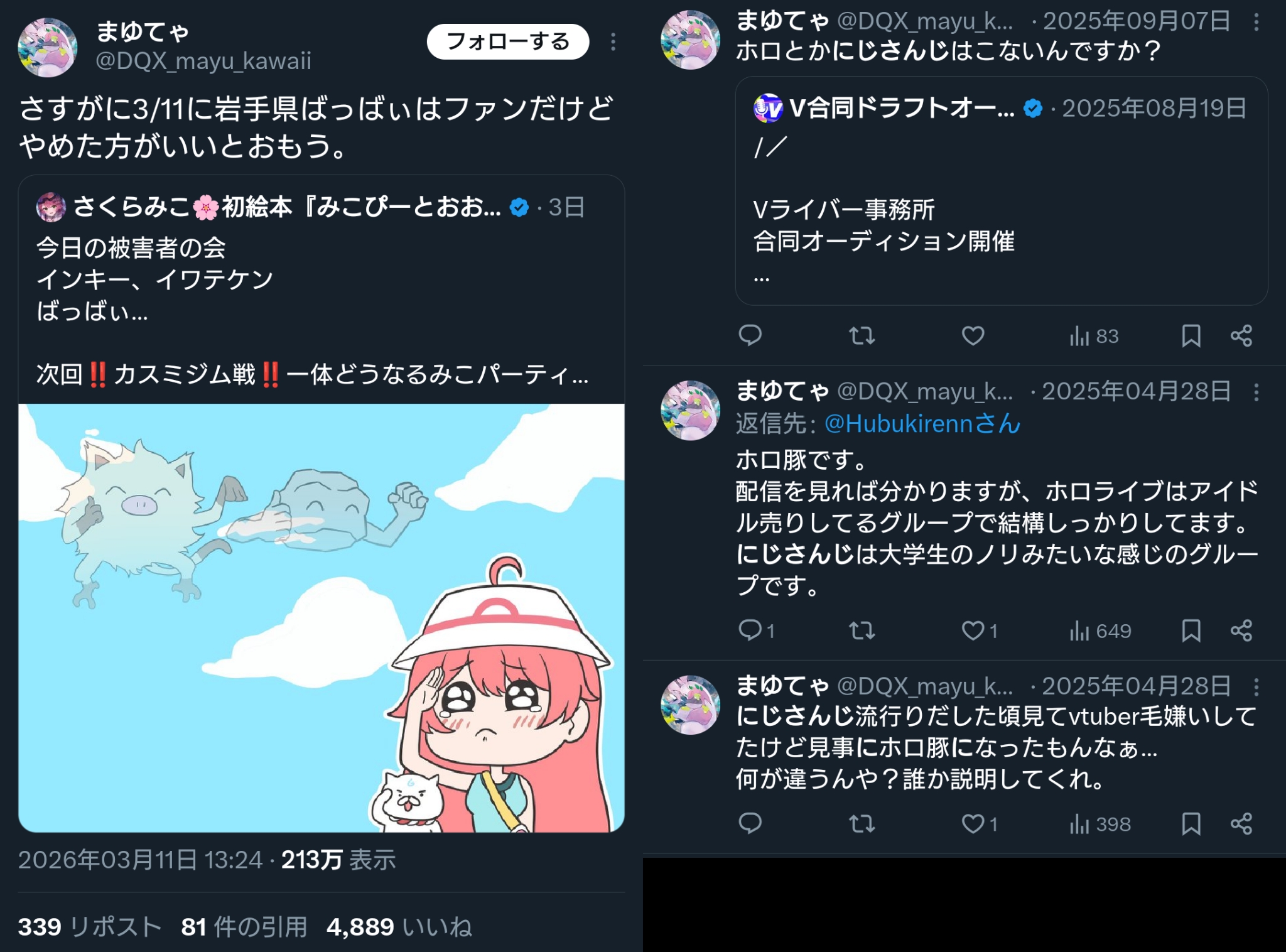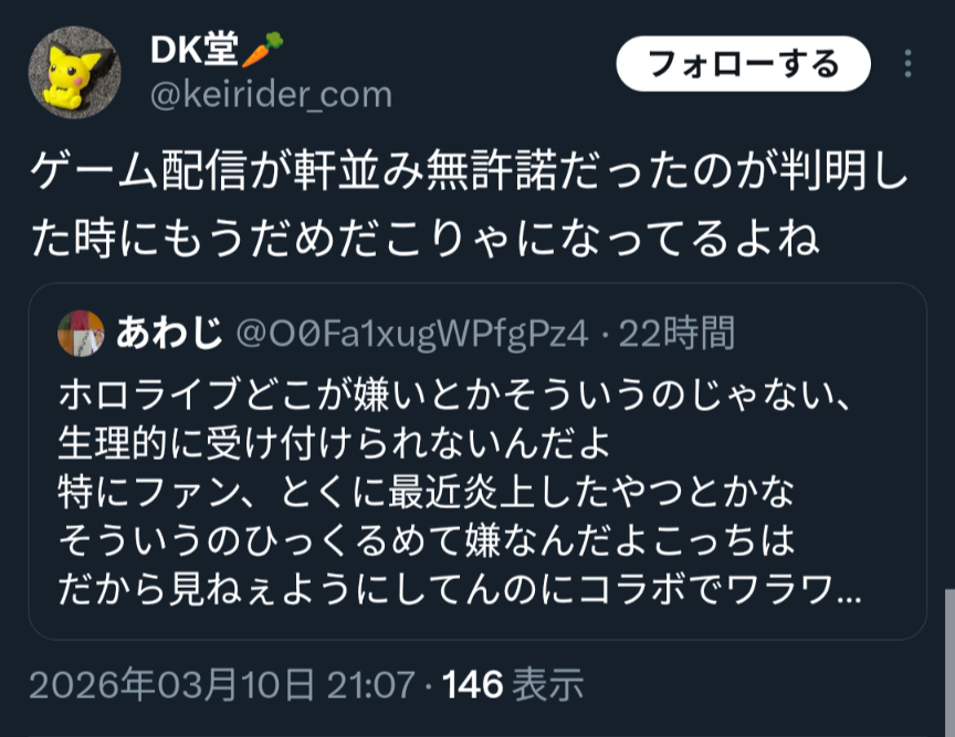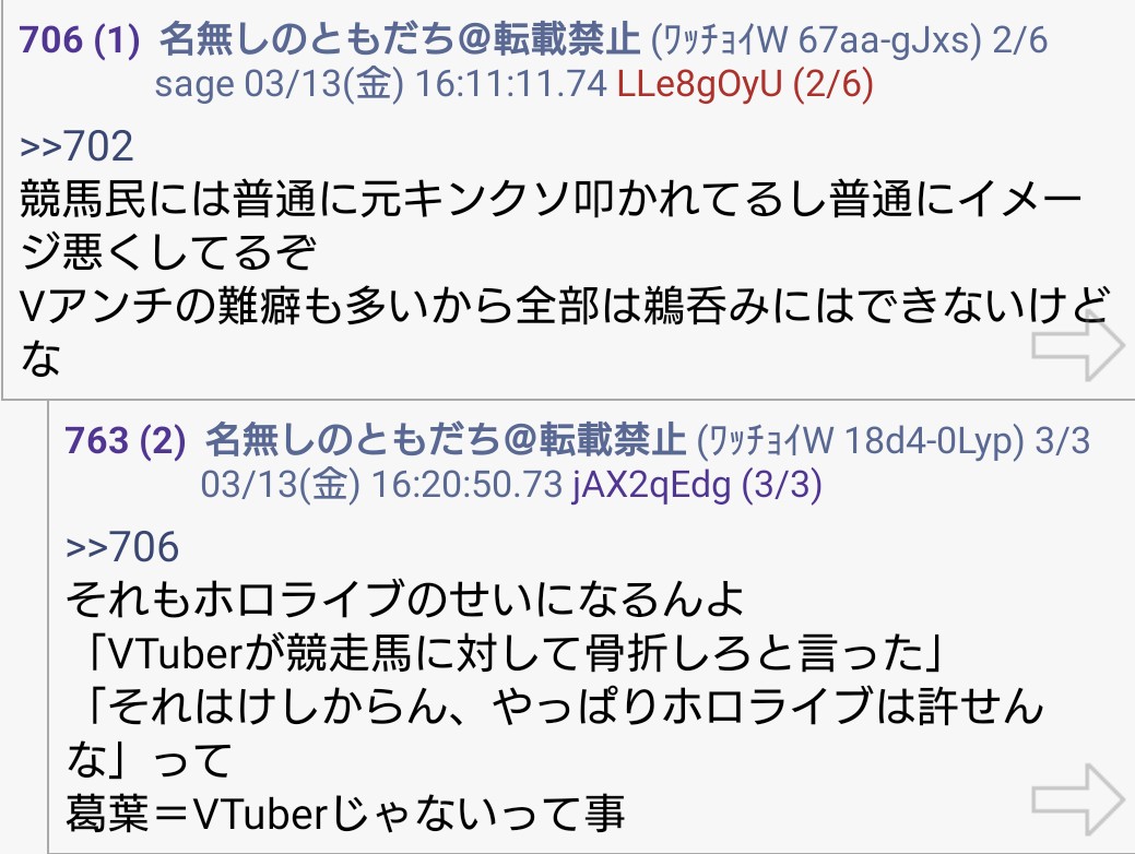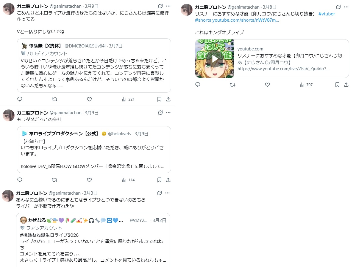 | … | 72無題Name名無し 26/03/07(土)23:06:30No.1955646そうだねx12「ホロライブが出してるのは残飯か豚の餌」(葛葉、フレン、にじさんじ、奈羅花、くろのわ、ろふまお、石神、不破リスナー)※過去に湊あくあが卒業ライブで歌った乃木坂の曲のMV、でびでびでびるの炎上に際して、それぞれ非Vファンのような口ぶりで粘着していた点に留意 |