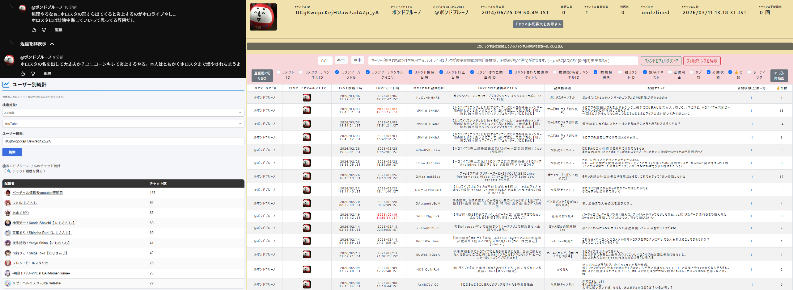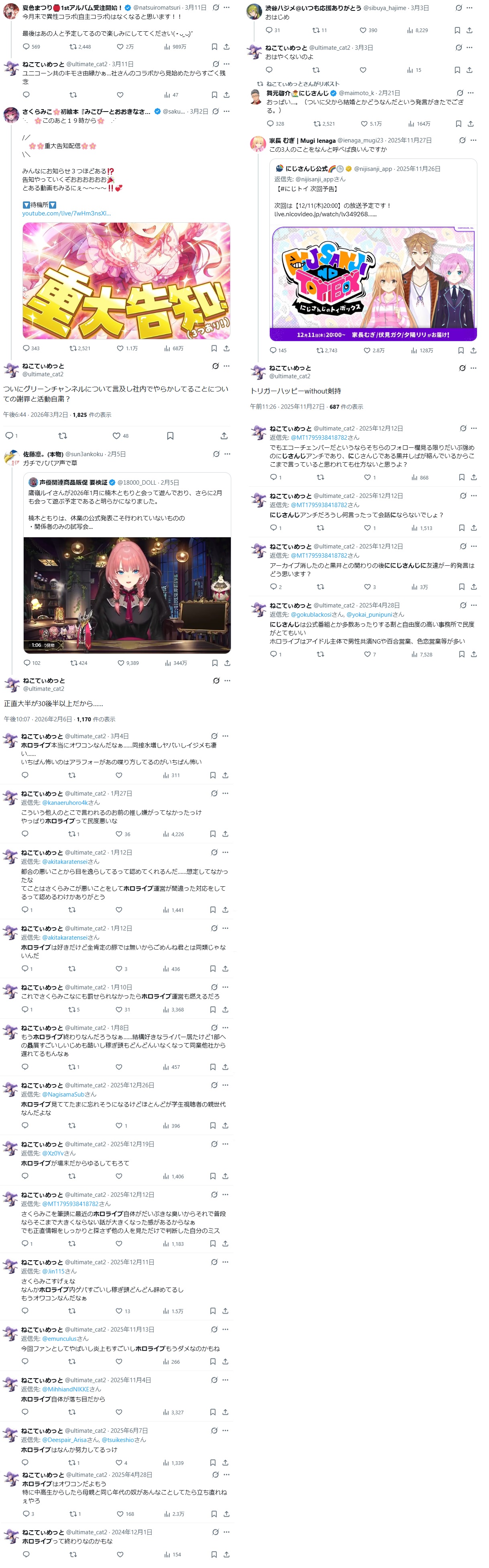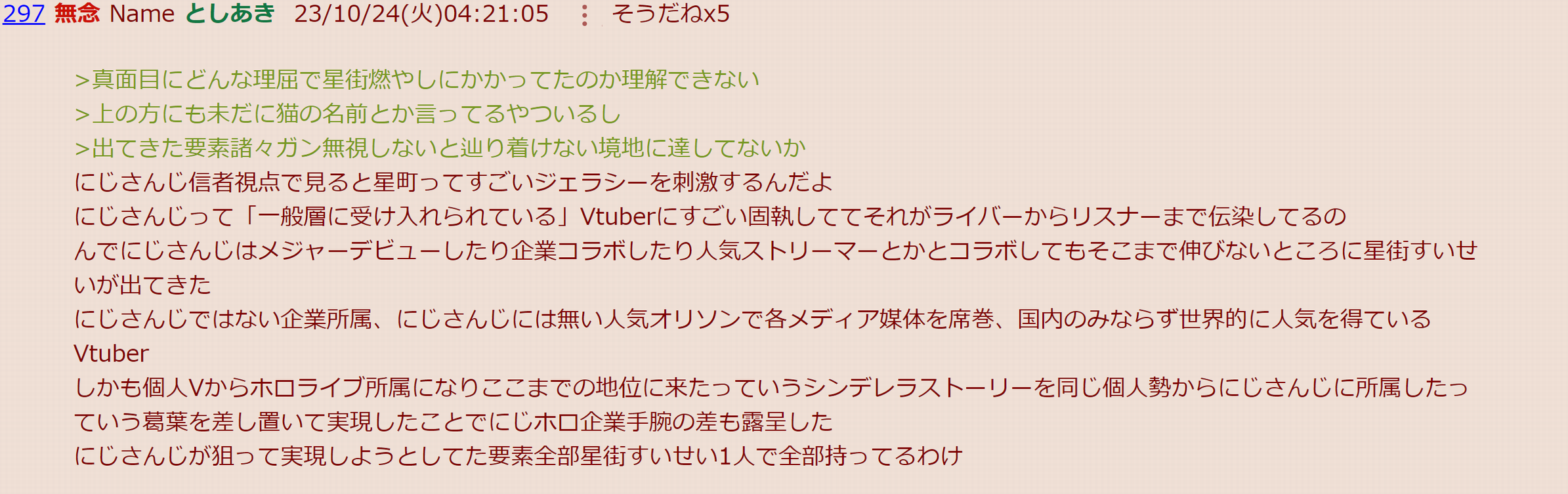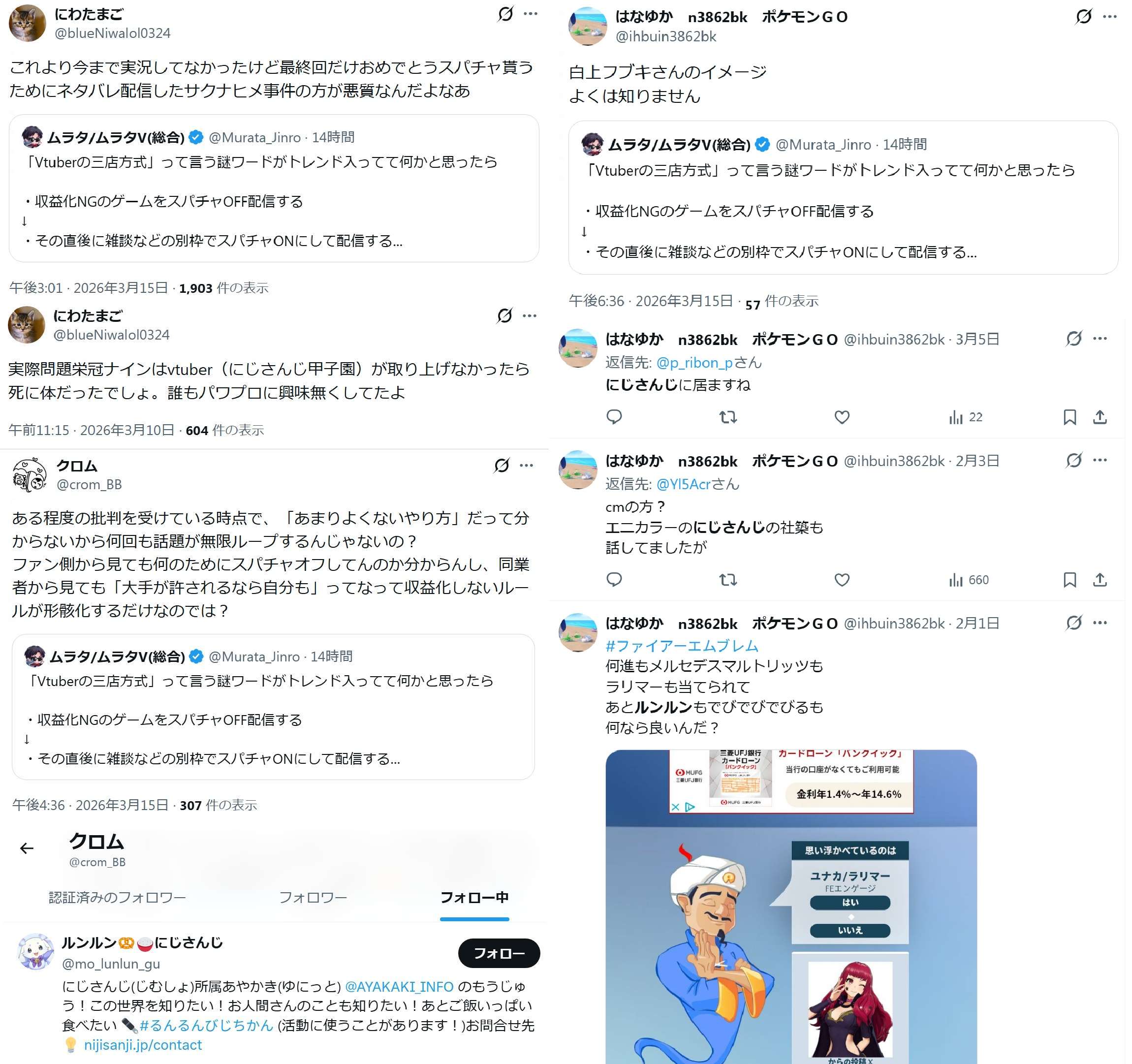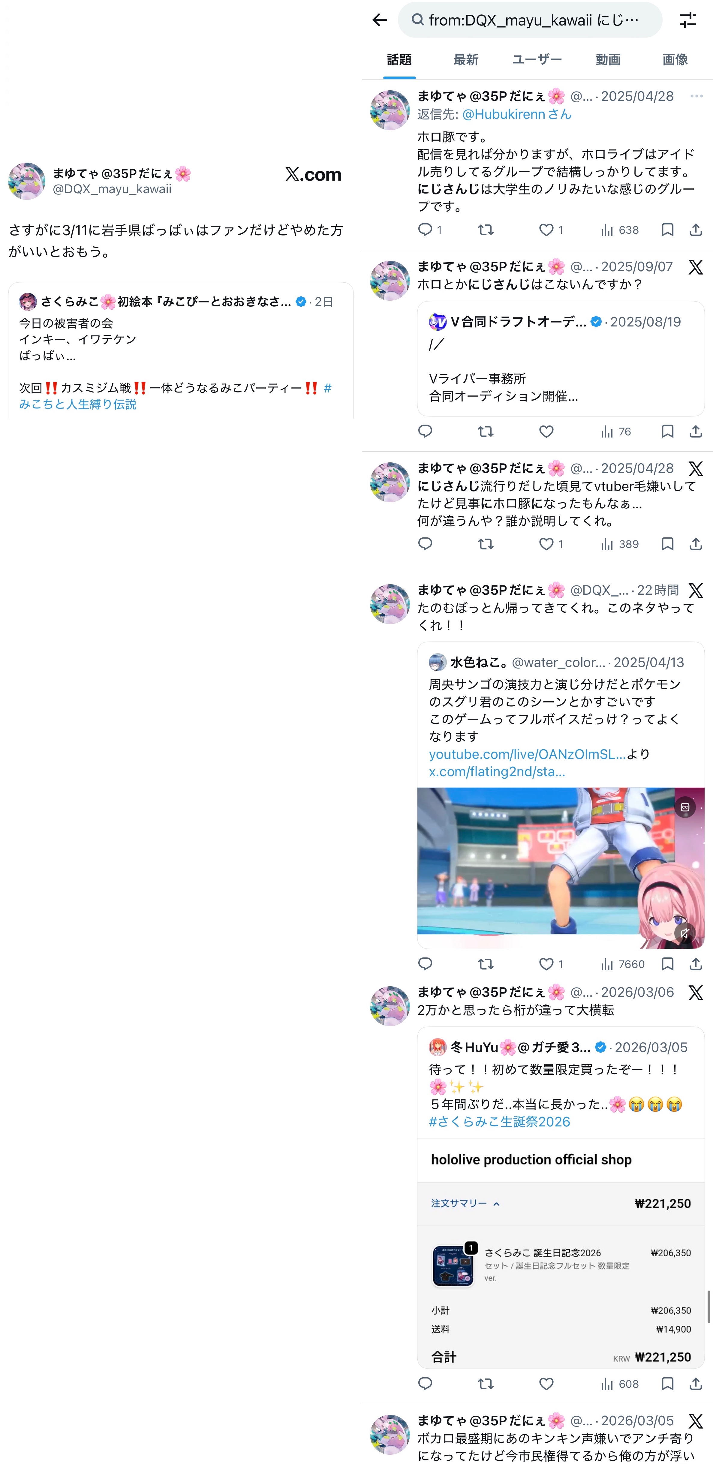 | … | 72無題Name名無し 26/03/07(土)23:06:30No.1955646そうだねx12「ホロライブが出してるのは残飯か豚の餌」(葛葉、フレン、にじさんじ、奈羅花、くろのわ、ろふまお、石神、不破リスナー)※過去に湊あくあが卒業ライブで歌った乃木坂の曲のMV、でびでびでびるの炎上に際して、それぞれ非Vファンのような口ぶりで粘着していた点に留意 |
