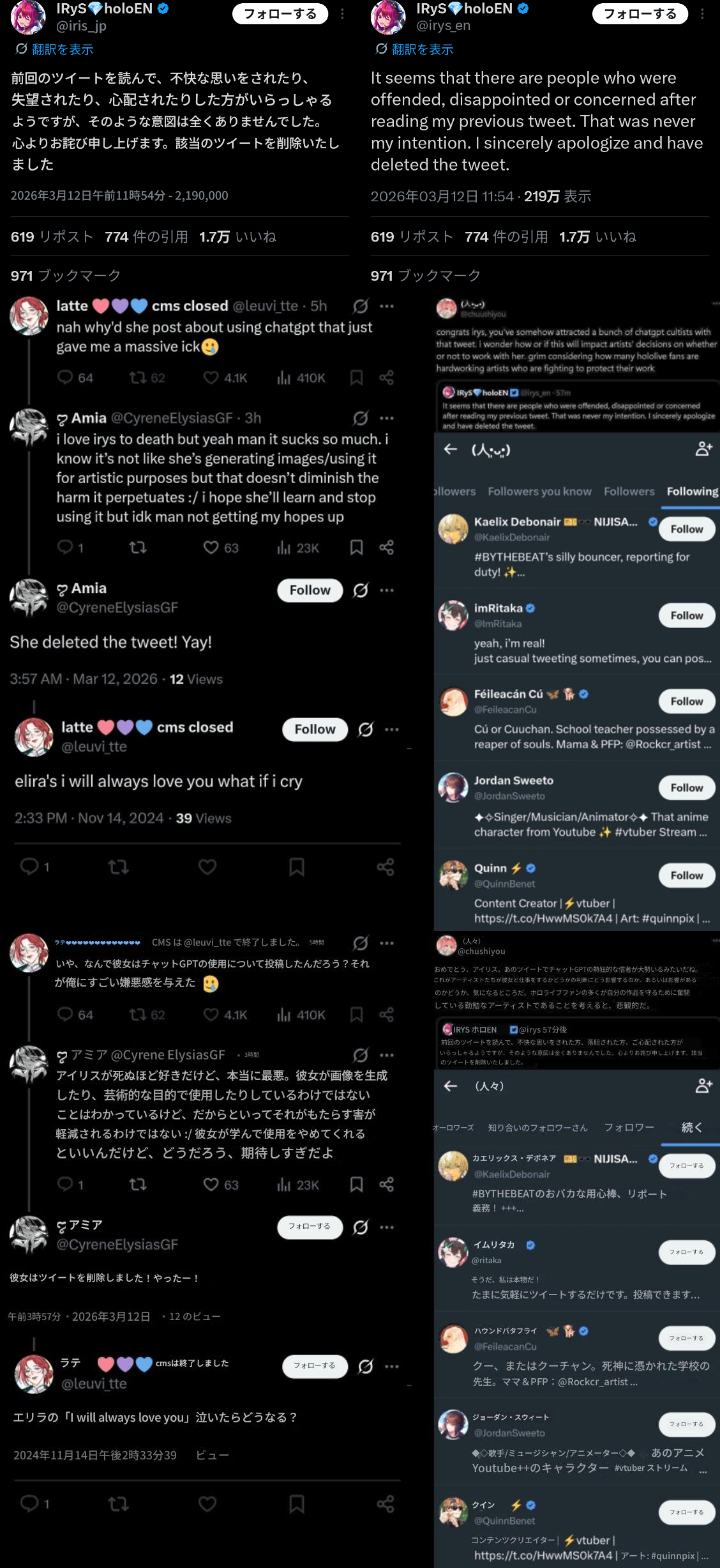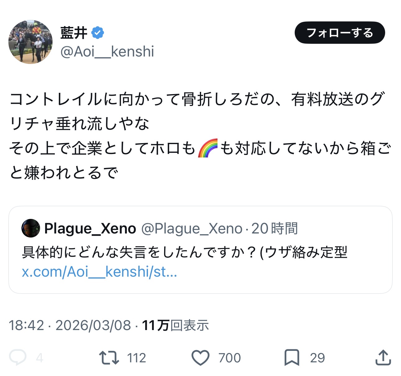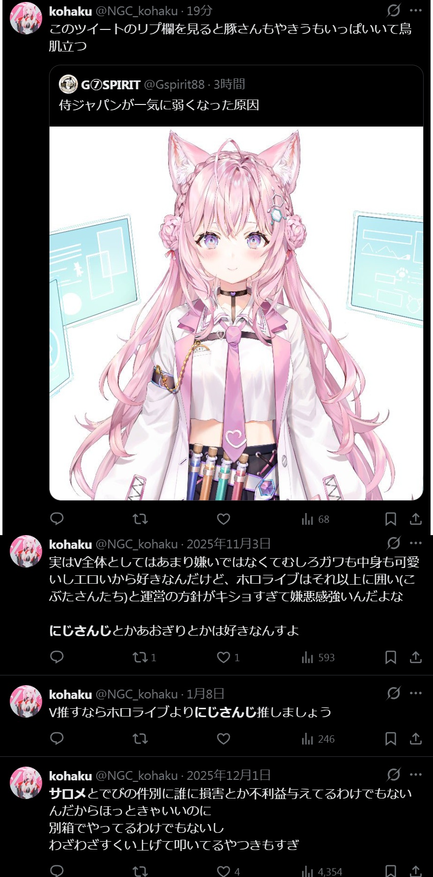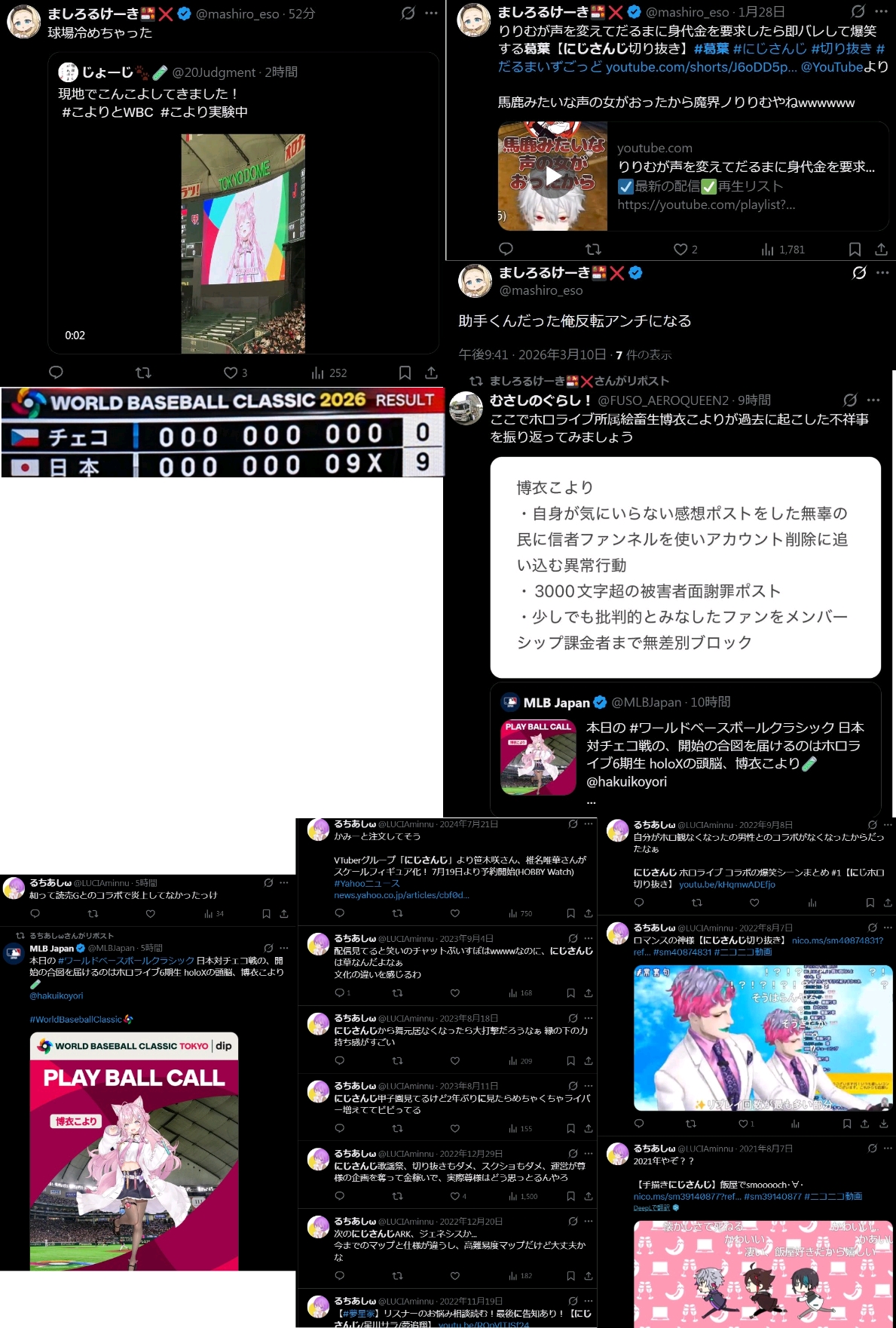 | … | 72無題Name名無し 26/03/07(土)23:06:30No.1955646そうだねx12「ホロライブが出してるのは残飯か豚の餌」(葛葉、フレン、にじさんじ、奈羅花、くろのわ、ろふまお、石神、不破リスナー)※過去に湊あくあが卒業ライブで歌った乃木坂の曲のMV、でびでびでびるの炎上に際して、それぞれ非Vファンのような口ぶりで粘着していた点に留意 |